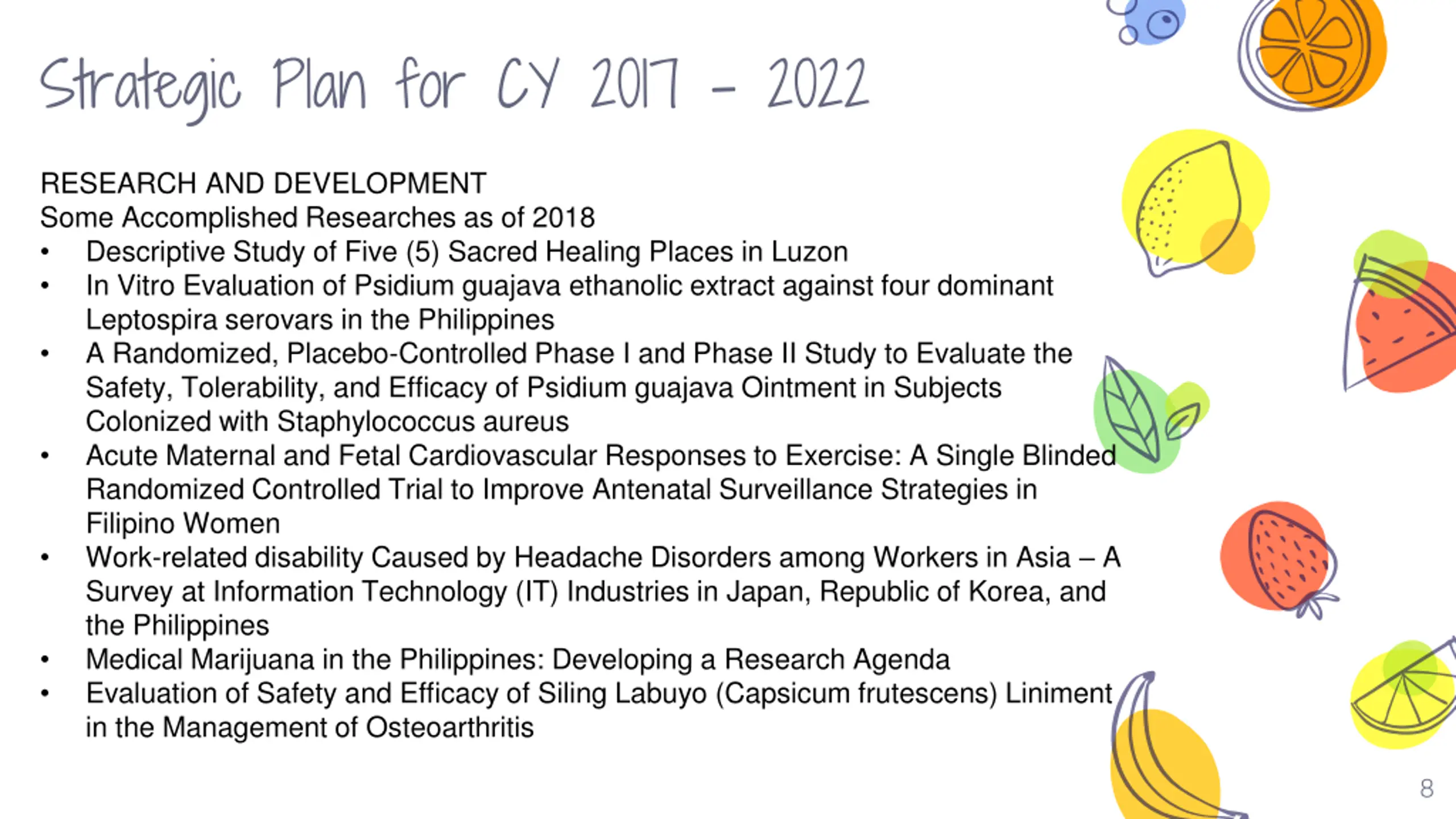 Strategic Plan for CY 2017 - 2022 RESEARCH AND DEVELOPMENT Some Accomplished Researches as of 2018 Descriptive Study of Five (5) Sacred Healing Places in Luzon In Vitro Evaluation of Psidium guajava ethanolic extract against four dominant Leptospira serovars in the Philippines A Randomized, Placebo-Controlled Phase I and Phase II Study to Evaluate the Safety, Tolerability, and Efficacy of Psidium guajava Ointment in Subjects Colonized with Staphylococcus aureus Acute Maternal and Fetal Cardiovascular Responses to Exercise: A Single Blinded Randomized Controlled Trial to Improve Antenatal Surveillance Strategies in Filipino Women Work-related disability Caused by Headache Disorders among Workers in Asia A Survey at Information Technology (IT) Industries in Japan, Republic of Korea, and the Philippines Medical Marijuana in the Philippines: Developing a Research Agenda Evaluation of Safety and Efficacy of Siling Labuyo (Capsicum frutescens) Liniment in the Management of Osteoarthritis 8