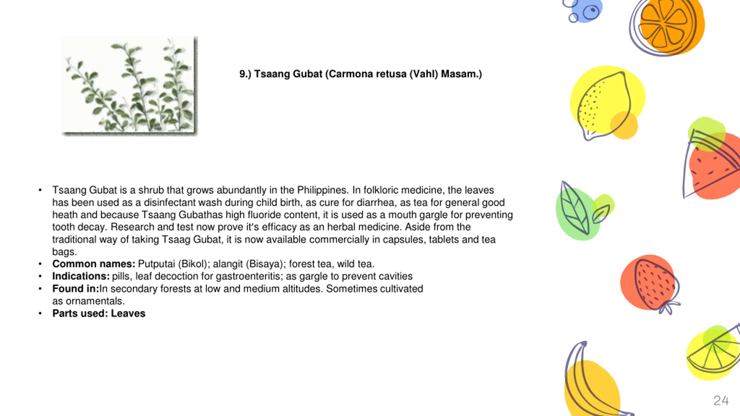 Tsaang Gubat (Carmona retusa (Vahl) Masam.) 9.) Tsaang Gubat (Carmona retusa (Vahl) Masam.) Tsaang Gubat is a shrub that grows abundantly in the Philippines. In folkloric medicine, the leaves has been used as a disinfectant wash during child birth, as cure for diarrhea, as tea for general good heath and because Tsaang Gubathas high fluoride content, it is used as a mouth gargle for preventing tooth decay. Research and test now prove it s efficacy as an herbal medicine. Aside from the traditional way of taking Tsaag Gubat, it is now available commercially in capsules, tablets and tea bags. Common names: Putputai (Bikol); alangit (Bisaya); forest tea, wild tea. Indications: pills, leaf decoction for gastroenteritis; as gargle to prevent cavities Found in:In secondary forests at low and medium altitudes. Sometimes cultivated as ornamentals. Parts used: Leaves 24
