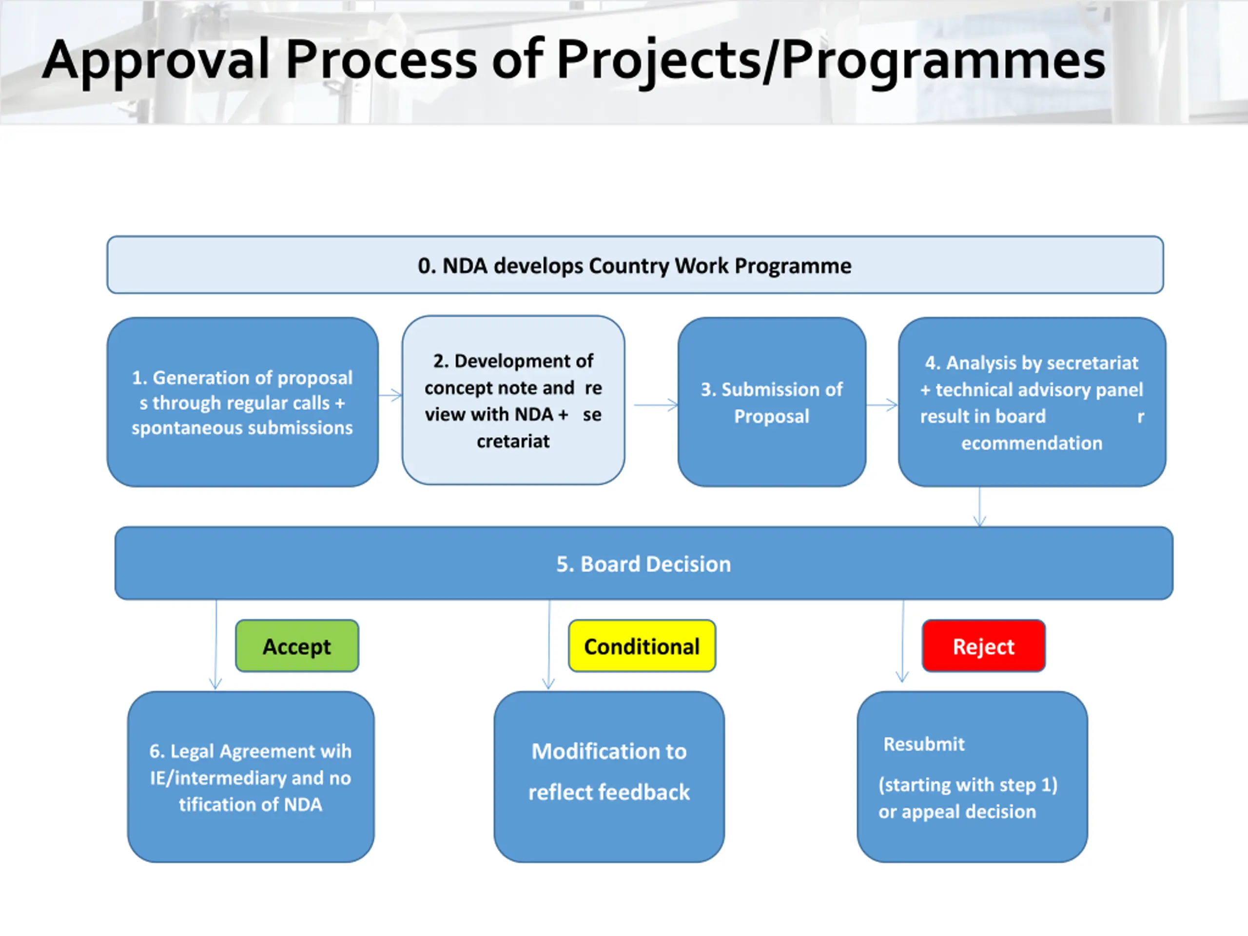 Approval Process of Projects/Programmes 0. NDA develops Country Work Programme 2. Development of concept note and re view with NDA + se cretariat 4. Analysis by secretariat + technical advisory panel result in board ecommendation 1. Generation of proposal s through regular calls + spontaneous submissions 3. Submission of Proposal r 5. Board Decision Accept Conditional Reject Resubmit Modification to 6. Legal Agreement wih IE/intermediary and no tification of NDA (starting with step 1) or appeal decision reflect feedback