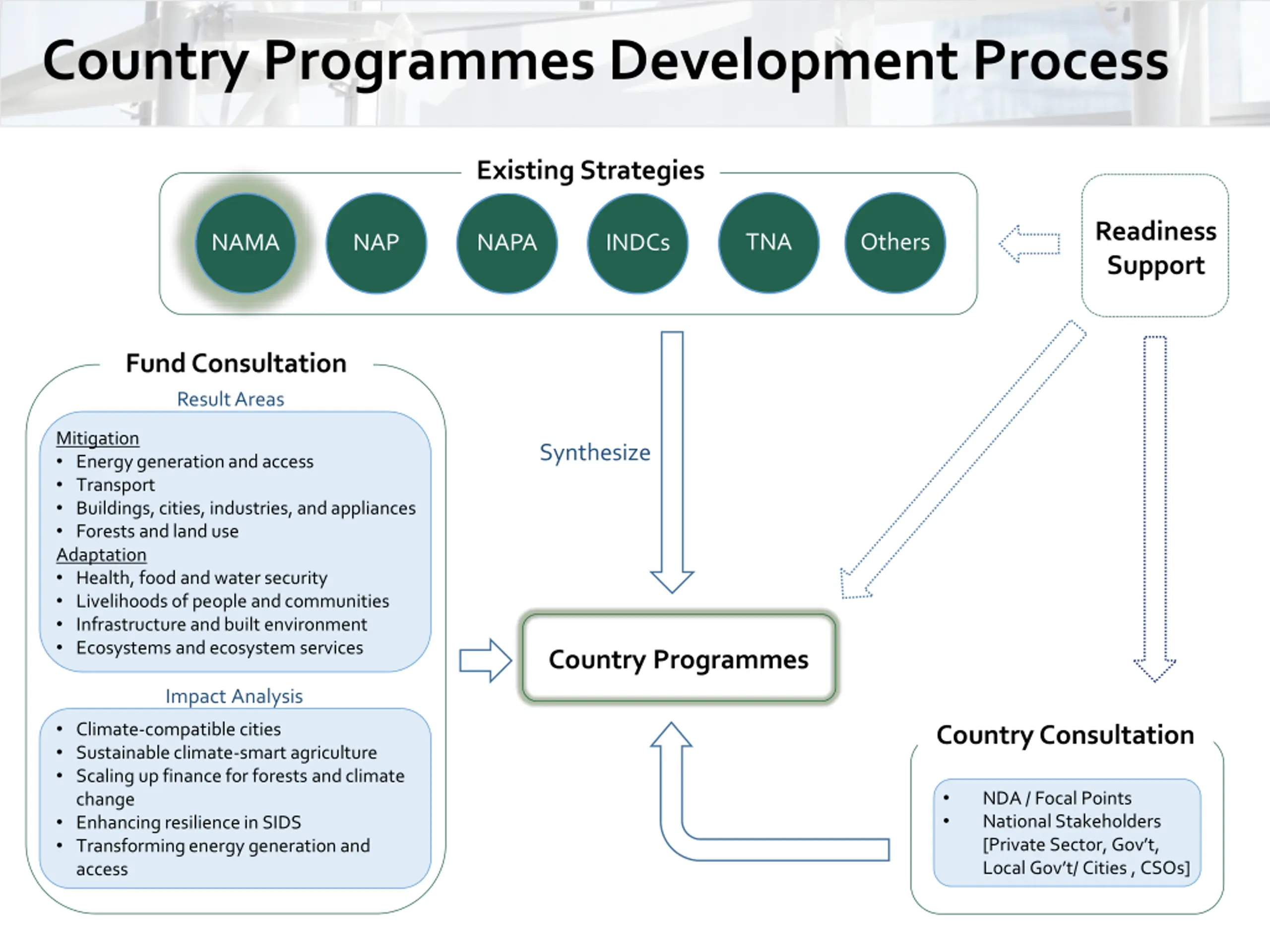 Draft Guidance for Country Programmes As part of the Activity Area 2, country programmes are driven by a robust process to engage stakeholders across government, local institutions, the private sector, and civil society to develop a clear sense of priority projects/programmes that the GCF can support . Country Programmes will include: 1. National Sustainable Development Context and Climate Change Response 2. Roles and Contributions of Key Stakeholders 3. Identification of GCF Priorities 4. Action Plan 5. Monitoring Section 1, which takes stock of existing strategies and policies, includes NAMAs as one of the key components to draw out priorityprojects and programmes