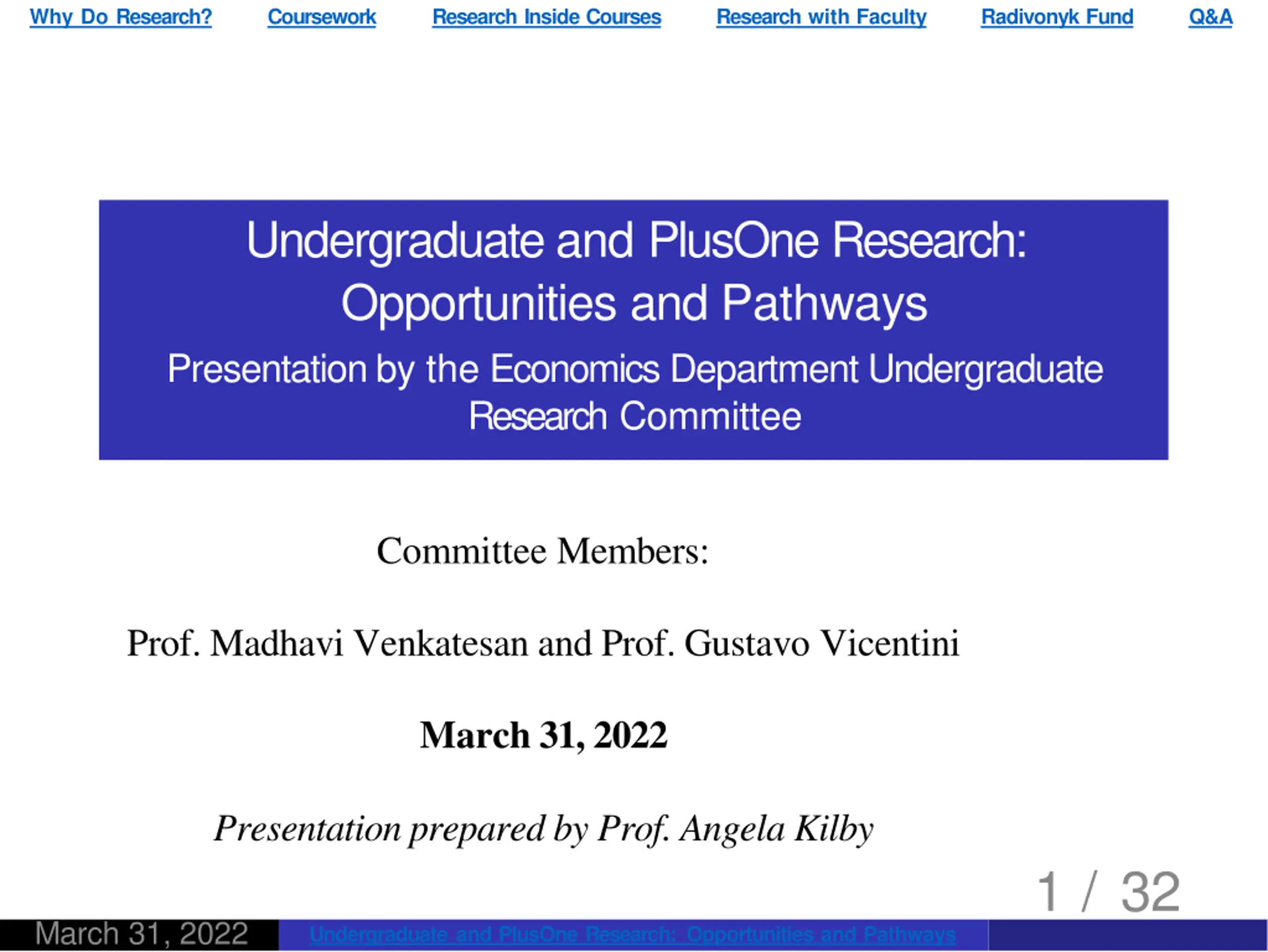 Why Do Research? Coursework Research Inside Courses Research with Faculty Radivonyk Fund Q&A Undergraduate and PlusOne Research: Opportunities and Pathways Presentation by the Economics Department Undergraduate Research Committee Committee Members: Prof. Madhavi Venkatesan and Prof. Gustavo Vicentini March 31, 2022 Presentation prepared by Prof. Angela Kilby 1 / 32 March 31, 2022 Undergraduate and PlusOne Research: Opportunities and Pathways