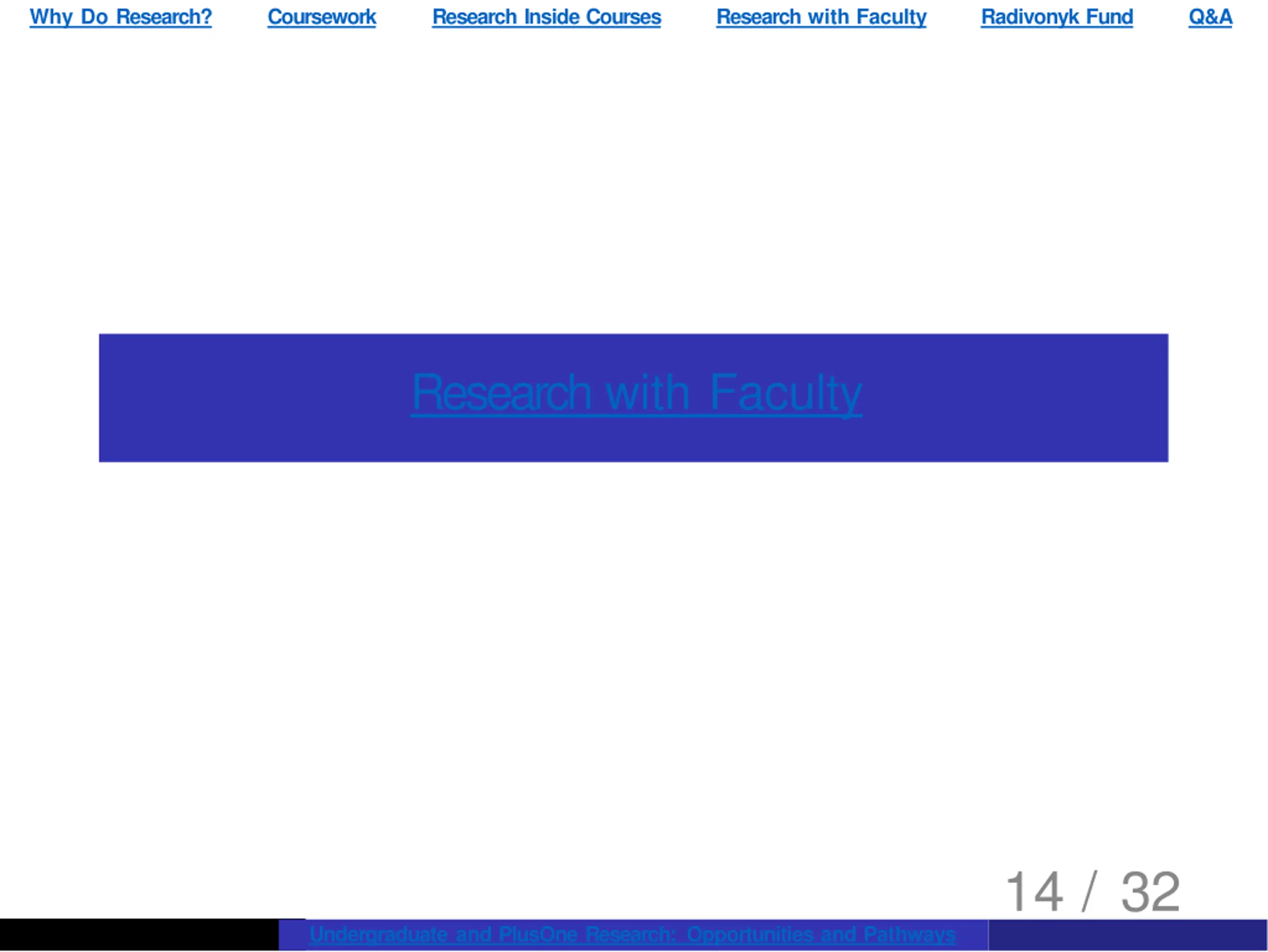 Why Do Research? Coursework Research Inside Courses Research with Faculty Radivonyk Fund Q&A Research with Faculty 14 / 32 Undergraduate and PlusOne Research: Opportunities and Pathways