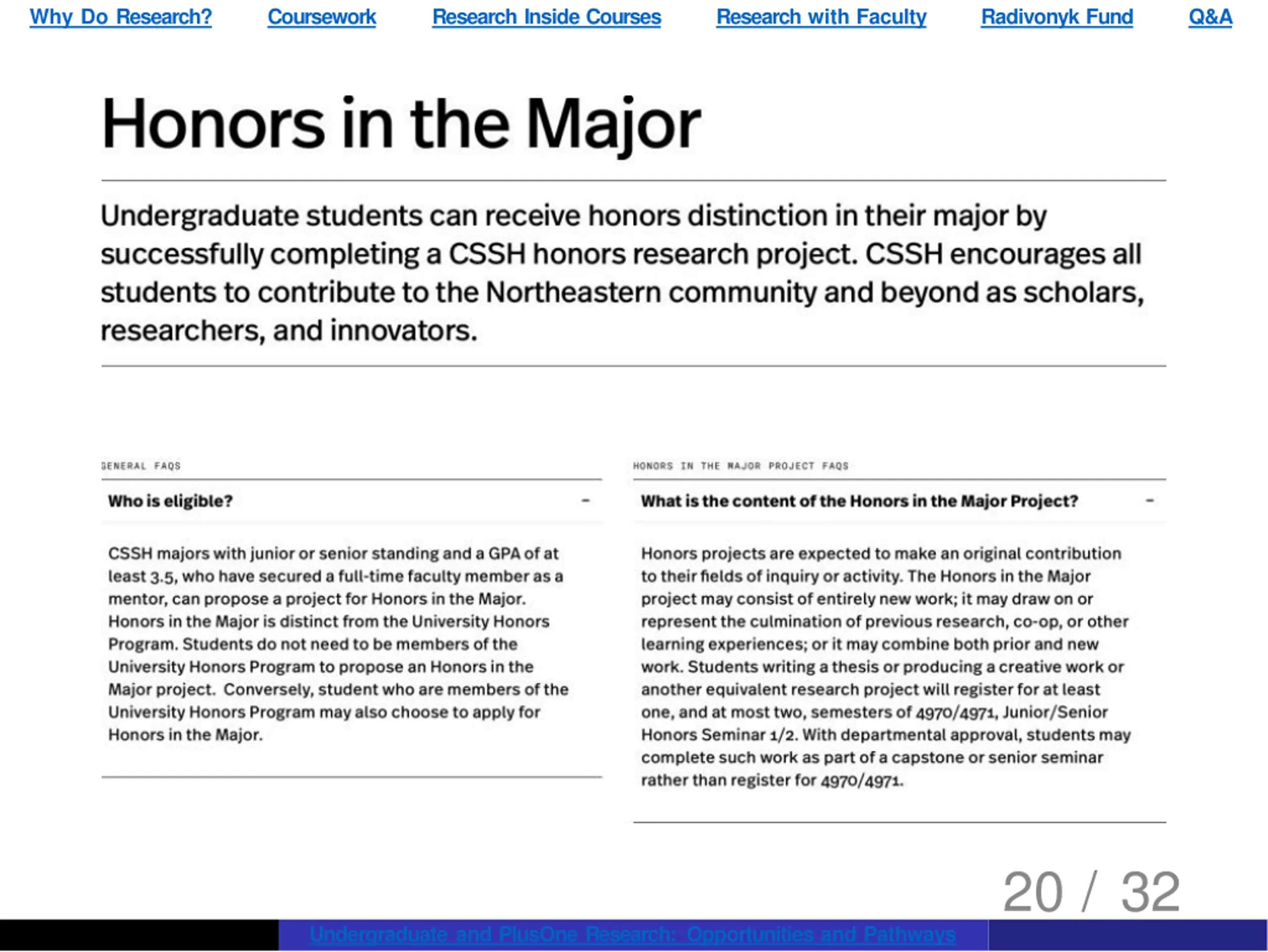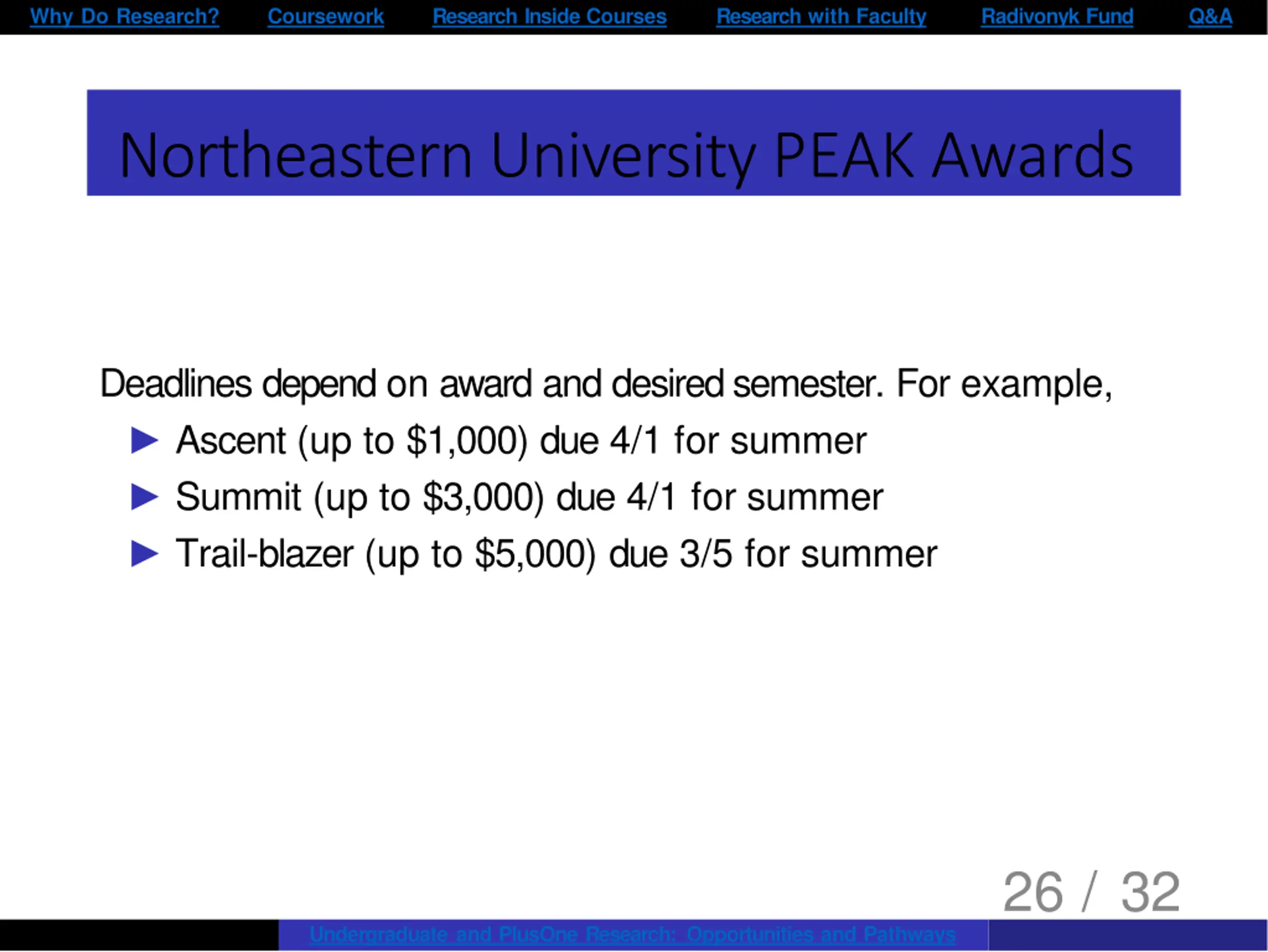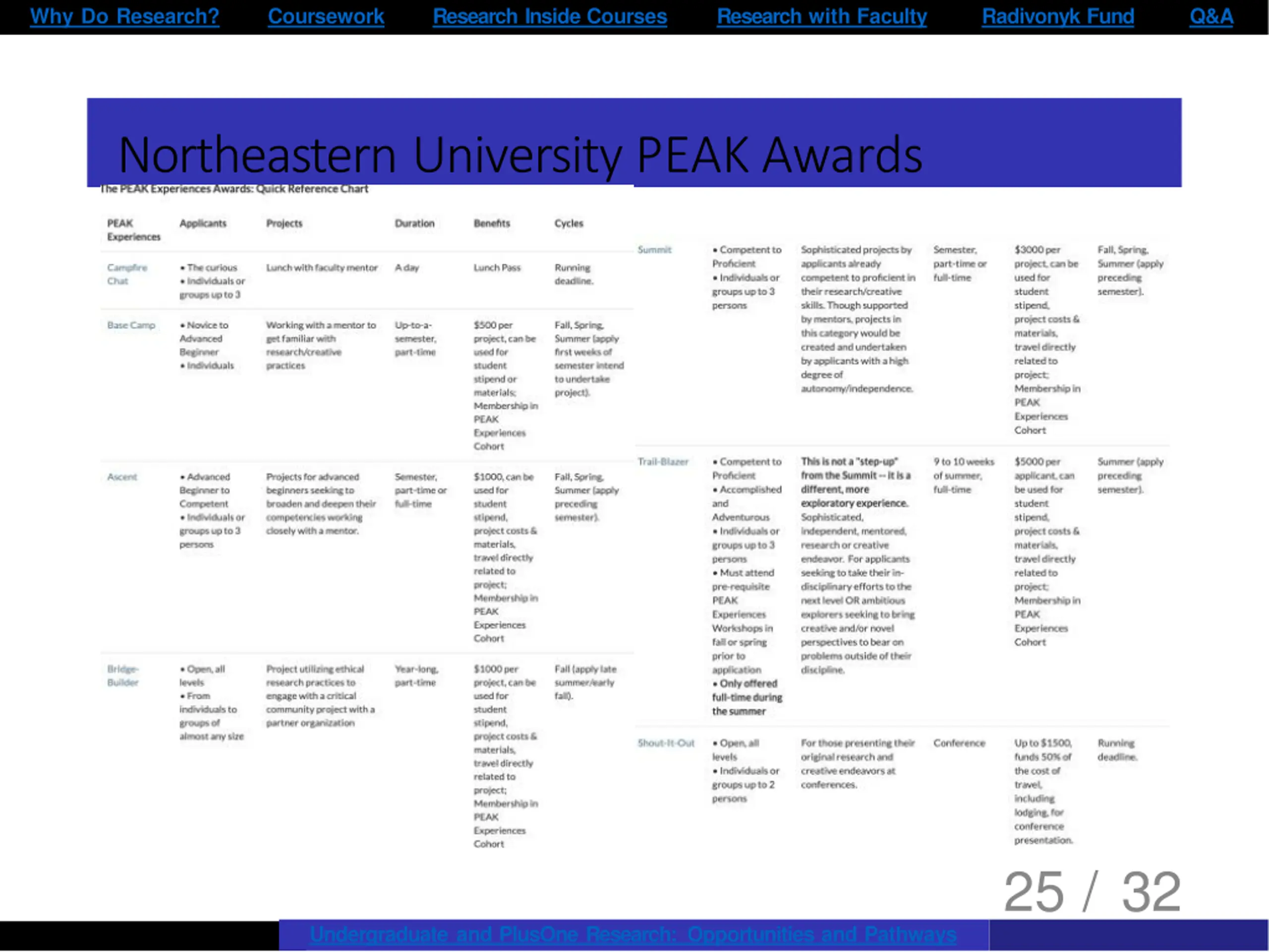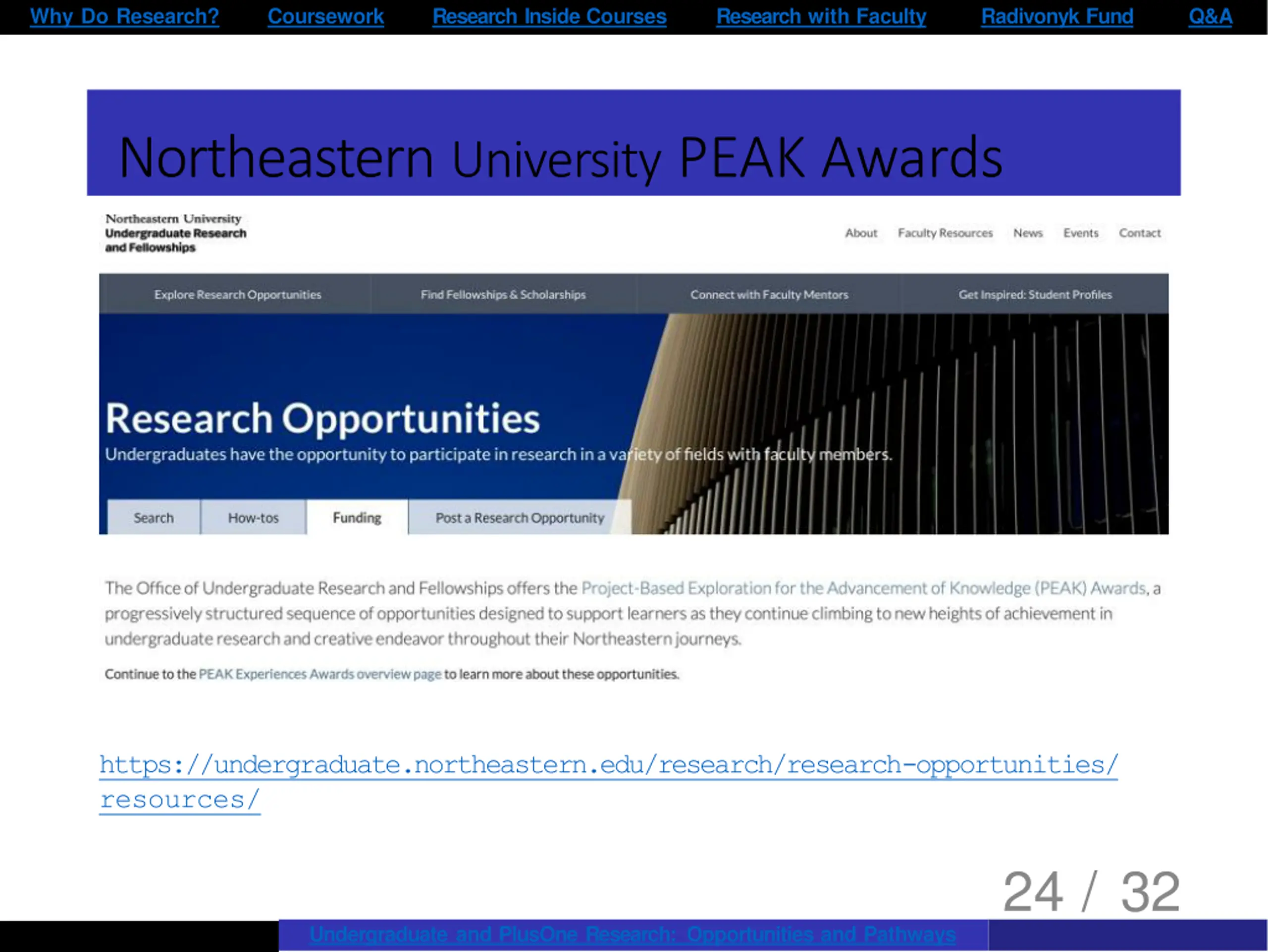 Why Do Research? Coursework Research Inside Courses Research with Faculty Radivonyk Fund Q&A Northeastern University PEAKAwards 25 / 32 Undergraduate and PlusOne Research: Opportunities and Pathways