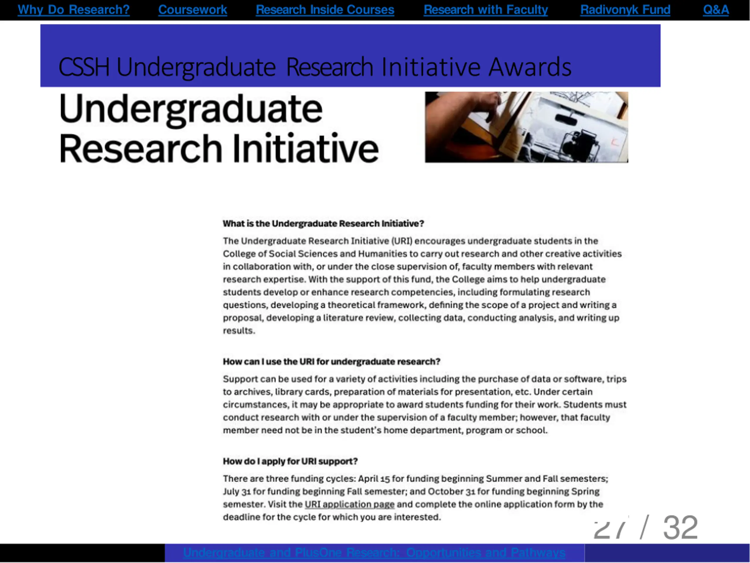 Why Do Research? Coursework Research Inside Courses Research with Faculty Radivonyk Fund Q&A CSSH UndergraduateResearchInitiative Awards 27 / 32 Undergraduate and PlusOne Research: Opportunities and Pathways