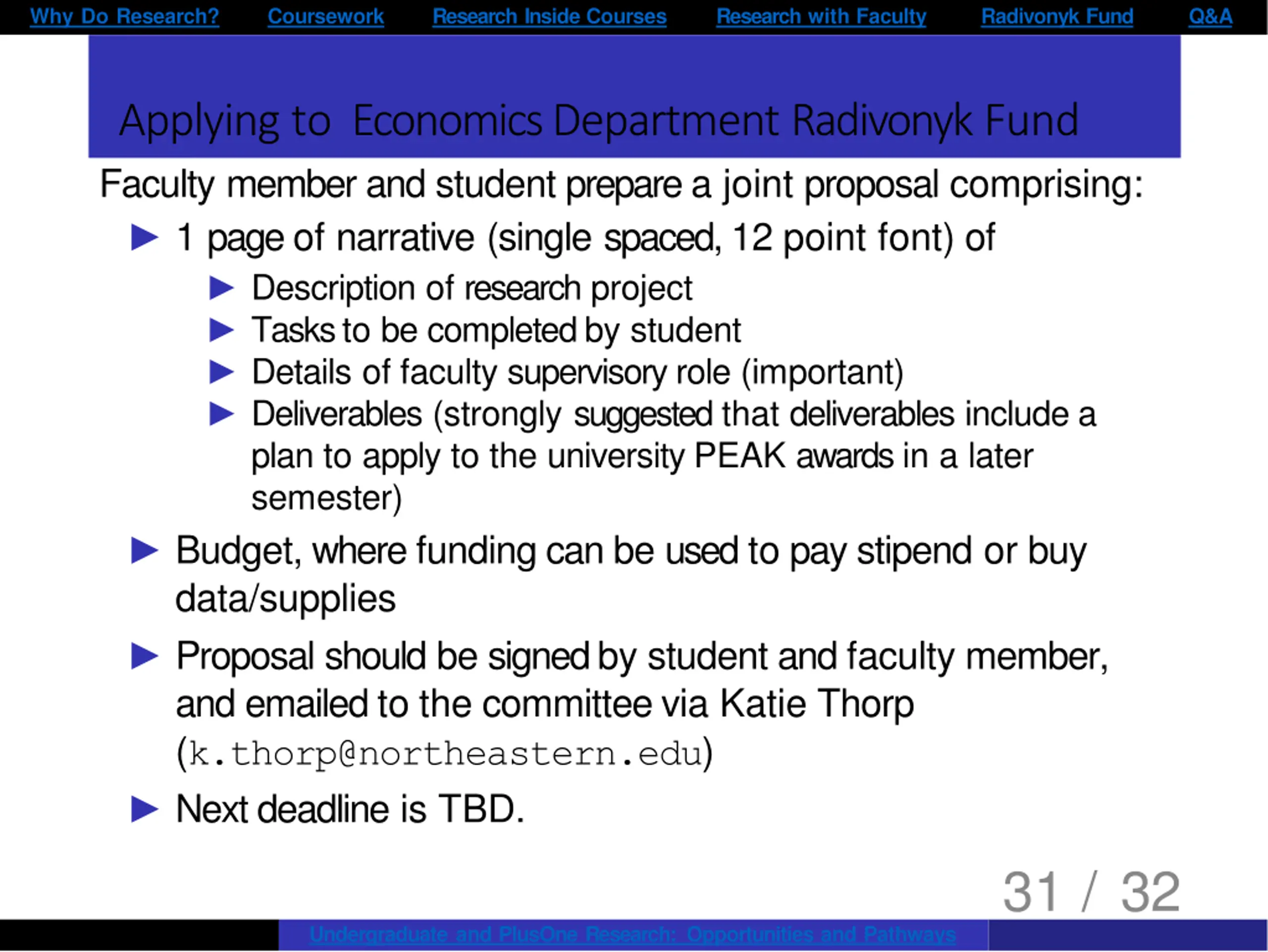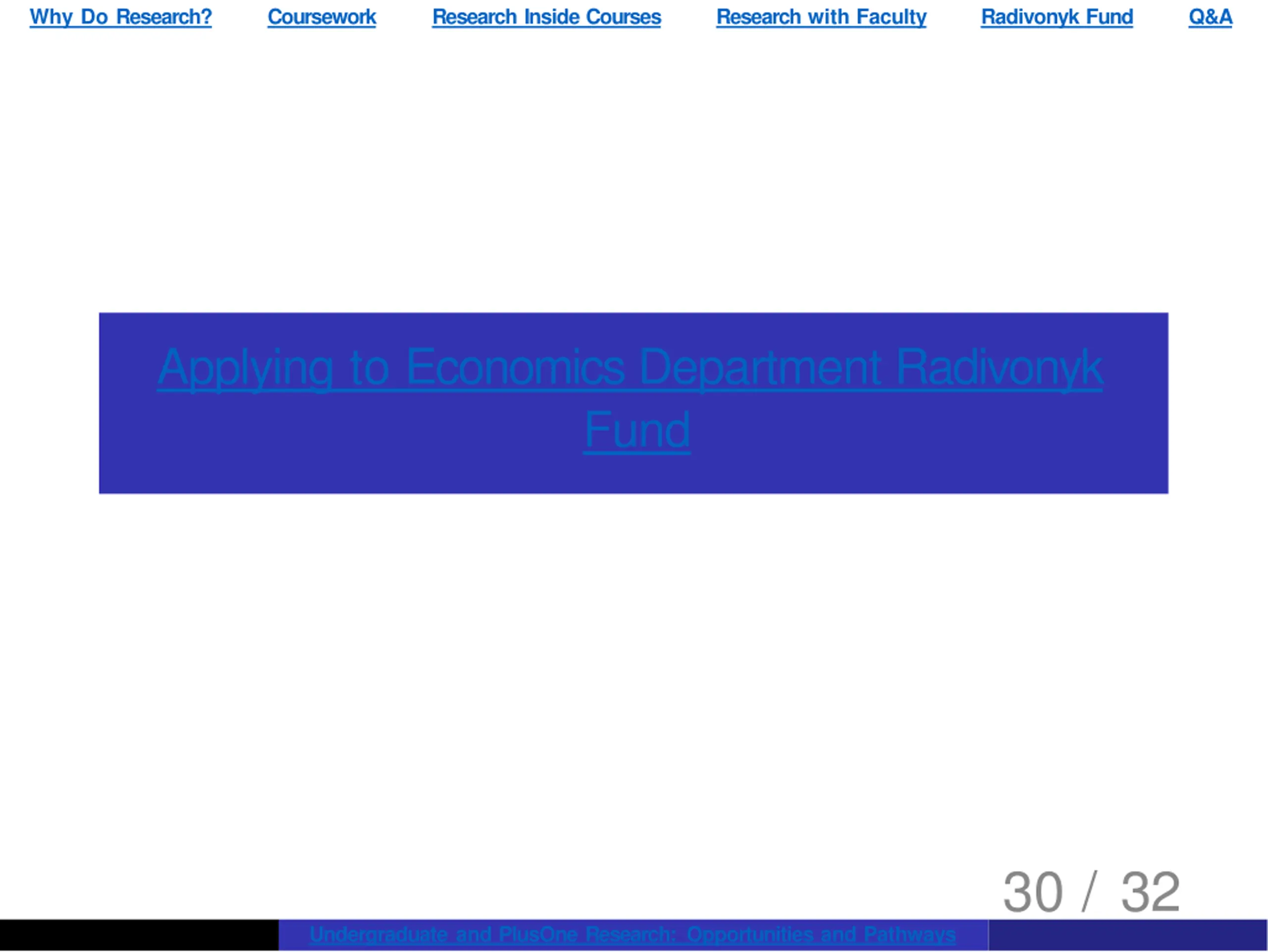 Why Do Research? Coursework Research Inside Courses Research with Faculty Radivonyk Fund Q&A Applying to Economics Department Radivonyk Fund 30 / 32 Undergraduate and PlusOne Research: Opportunities and Pathways