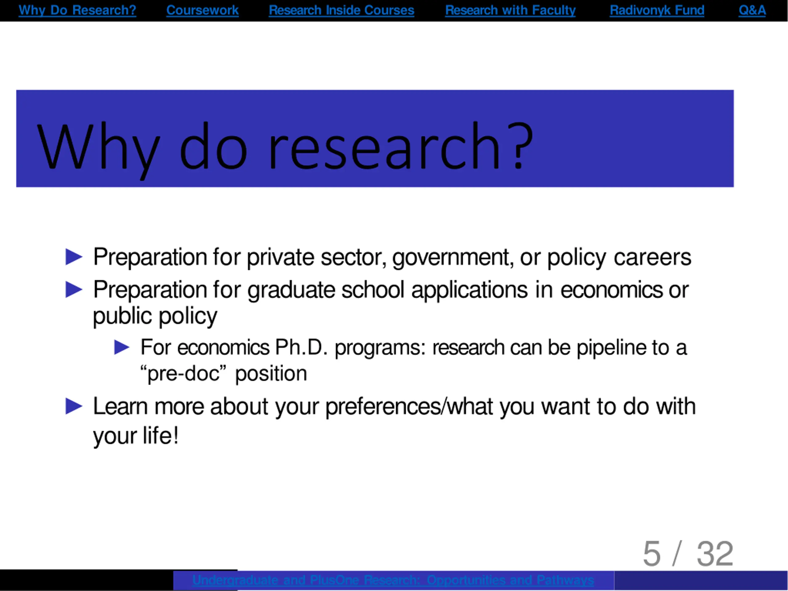 Why Do Research? Coursework Research Inside Courses Research with Faculty Radivonyk Fund Q&A Outline of Talk 1. Why Do Research? 2. Coursework, Preparation, and Pathways 3. Research Inside Courses 4. Research with Faculty Research For Credit/Transcript Notation Research For Pay 5. Applying to Economics Department Radivonyk Fund 6. Q&A 2 / 32 Undergraduate and PlusOne Research: Opportunities and Pathways
