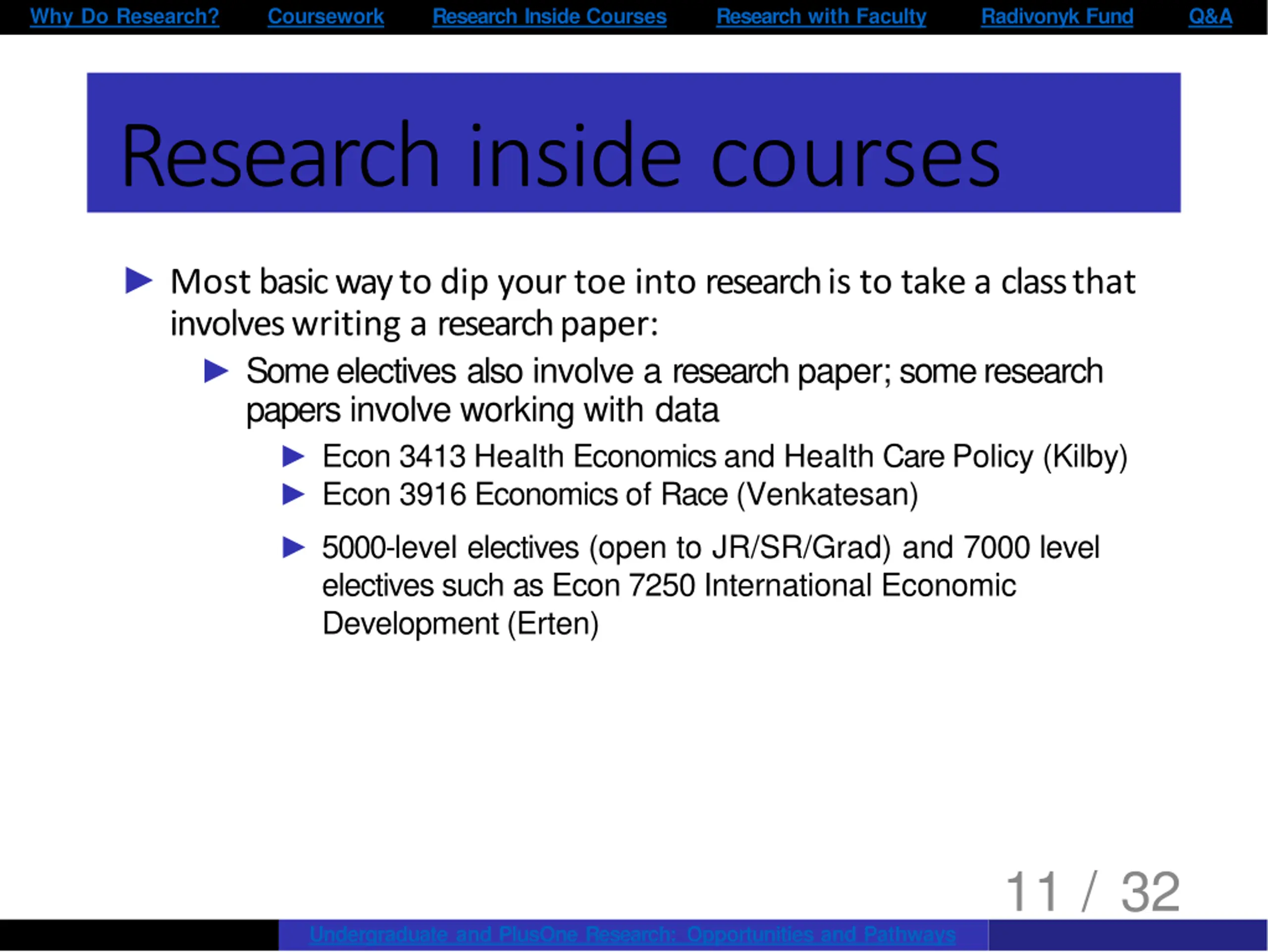 Why Do Research? Coursework Research Inside Courses Research with Faculty Radivonyk Fund Q&A Researchinside courses This is not a comprehensive list, and courses change as instructors change If in doubt, email professor in advance for syllabus/advice 12 / 32 Undergraduate and PlusOne Research: Opportunities and Pathways