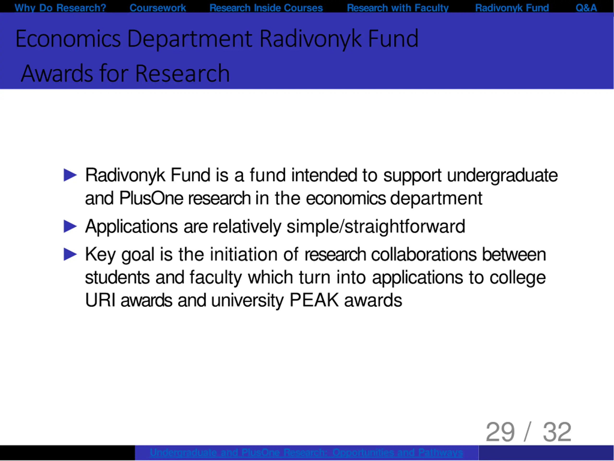 Why Do Research? Economics Department Radivonyk Fund Awards for Research Coursework Research Inside Courses Research with Faculty Radivonyk Fund Q&A Radivonyk Fund is a fund intended to support undergraduate and PlusOne research in the economics department Applications are relatively simple/straightforward Key goal is the initiation of research collaborations between students and faculty which turn into applications to college URI awards and university PEAK awards 29 / 32 Undergraduate and PlusOne Research: Opportunities and Pathways