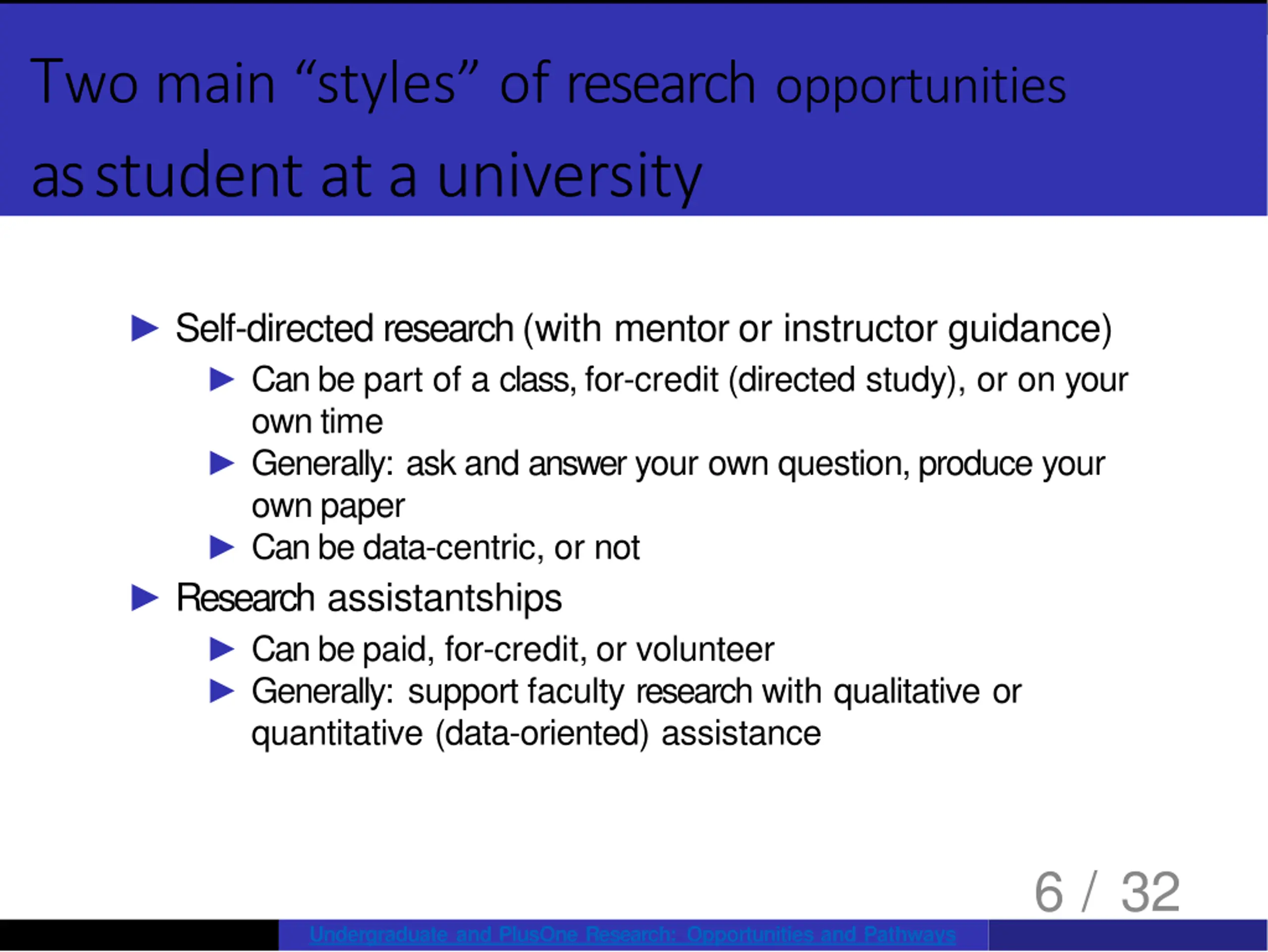 Why Do Research? Two main styles of researchopportunities asstudent at a university Coursework Research Inside Courses Research with Faculty Radivonyk Fund Q&A Self-directed research (with mentor or instructor guidance) Can be part of a class, for-credit (directed study), or on your own time Generally: ask and answer your own question, produce your own paper Can be data-centric, or not Research assistantships Can be paid, for-credit, or volunteer Generally: support faculty research with qualitative or quantitative (data-oriented) assistance 6 / 32 Undergraduate and PlusOne Research: Opportunities and Pathways