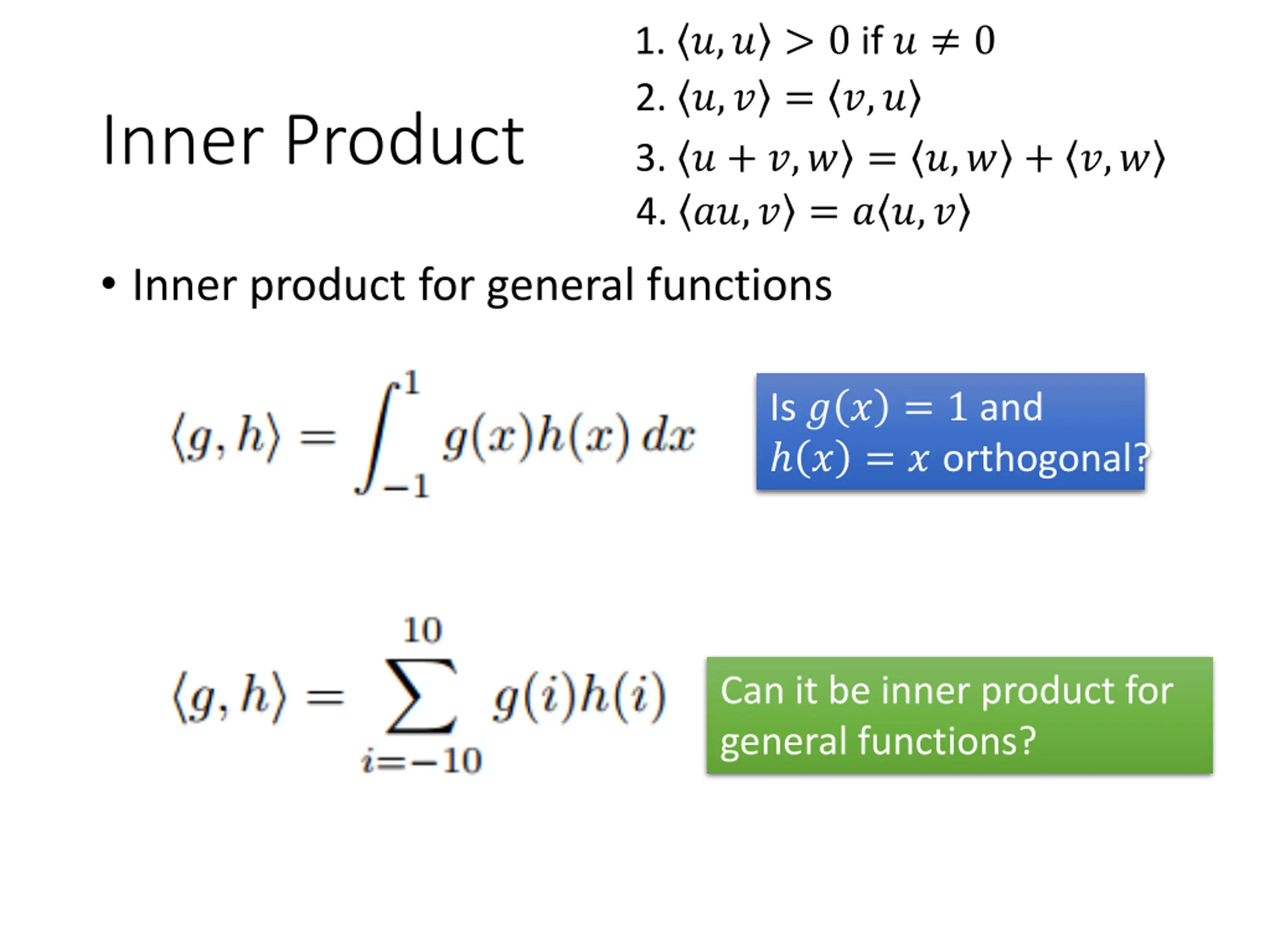 1. ?,? > 0 if ? 0 2. ?,? = ?,? 3. ? + ?,? = ?,? + ?,? Inner Product 4. ??,? = ? ?,? Inner product for general functions Is ? ? = 1 and ? = ? orthogonal? Can it be inner product for general functions?