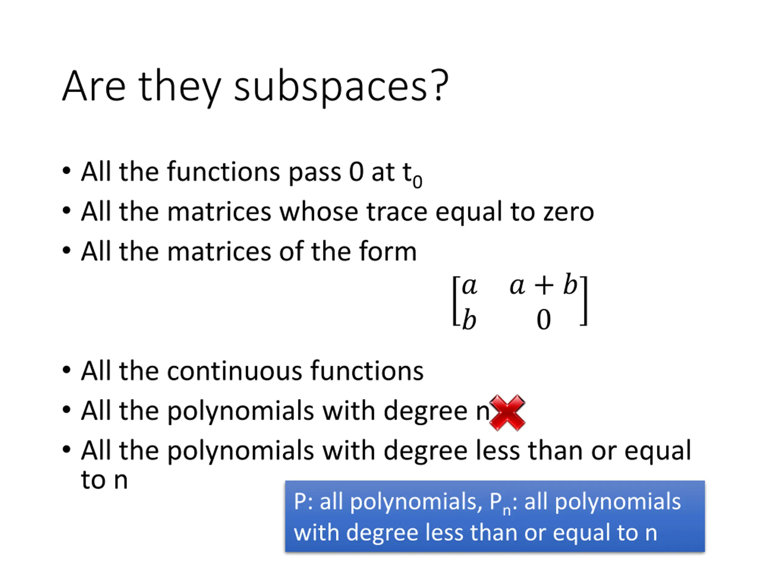 Are they subspaces? All the functions pass 0 at t0 All the matrices whose trace equal to zero All the matrices of the form ? ? ? + ? 0 All the continuous functions All the polynomials with degree n All the polynomials with degree less than or equal to n P: all polynomials, Pn: all polynomials with degree less than or equal to n