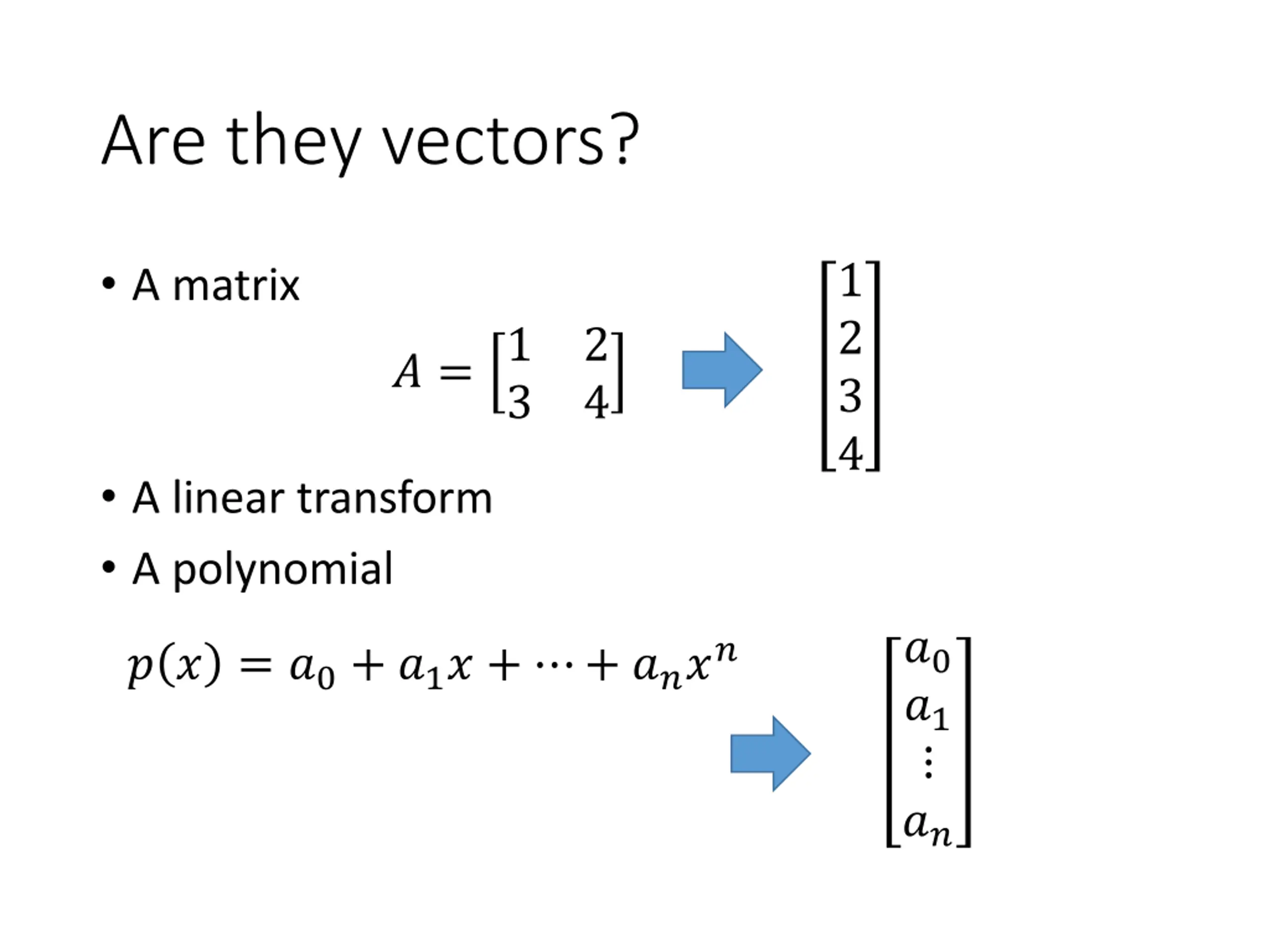 Are they vectors? A matrix 1 2 3 4 ? =1 2 4 3 A linear transform A polynomial ?0 ?1 ?? ? ? = ?0+ ?1? + + ????