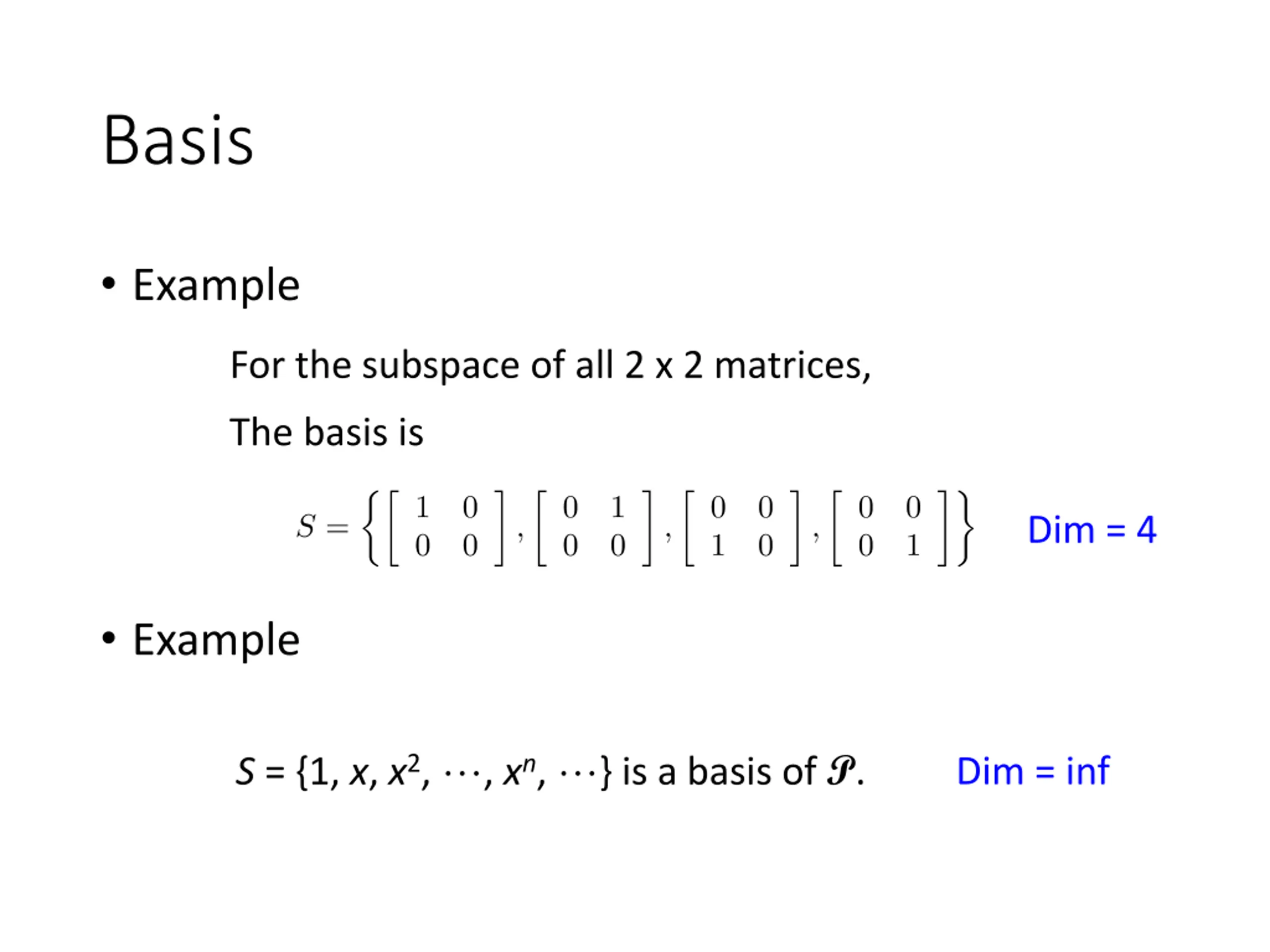 Basis Example For the subspace of all 2 x 2 matrices, The basis is Dim = 4 Example S = {1, x, x2, , xn, } is a basis of P. Dim = inf