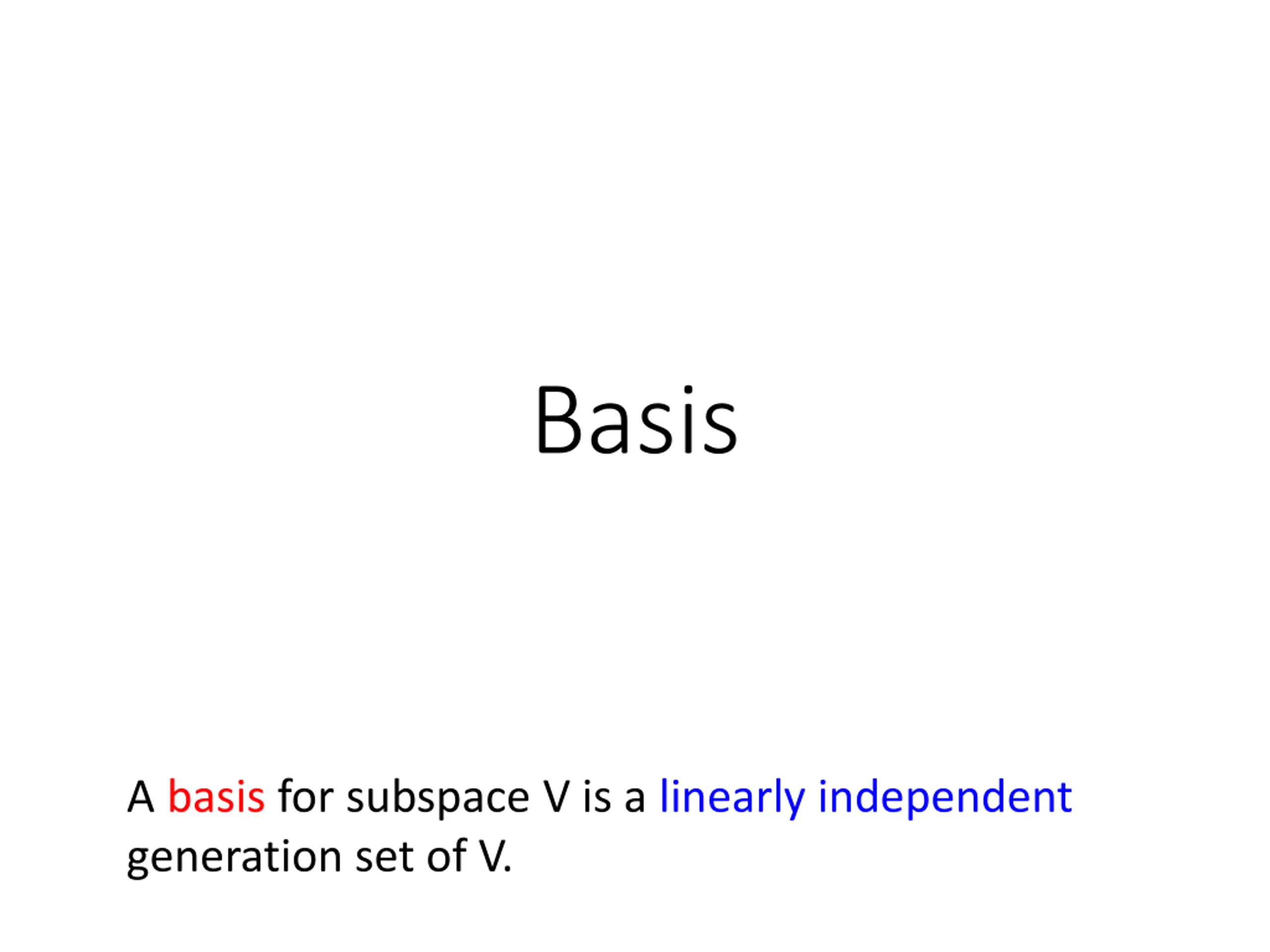 Basis A basis for subspace V is a linearly independent generation set of V.
