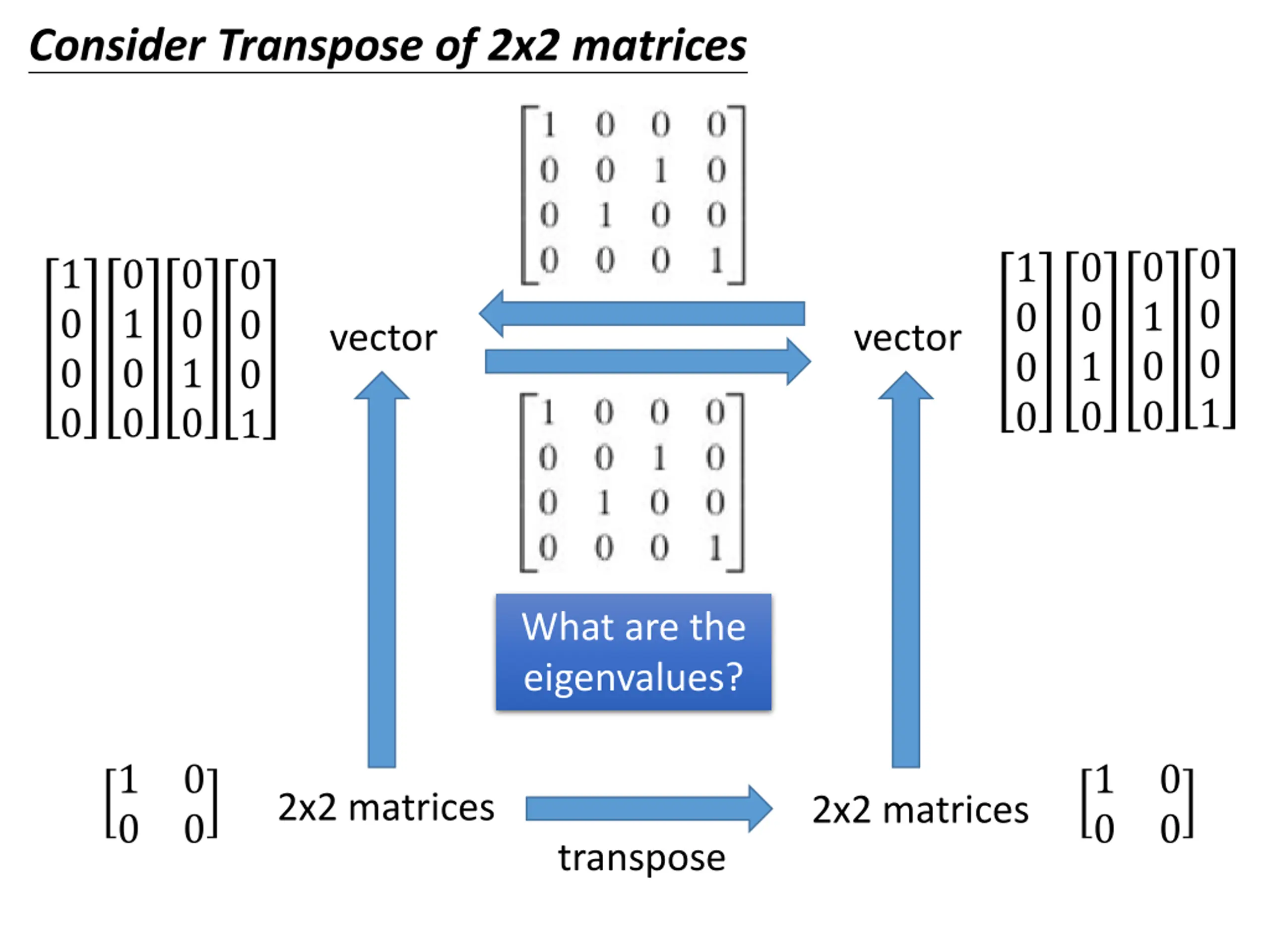 Consider Transpose of 2x2 matrices 0 0 0 1 0 1 0 0 0 0 1 0 1 0 0 0 1 0 0 0 0 1 0 0 0 0 1 0 0 0 0 1 vector vector What are the eigenvalues? 1 0 0 0 1 0 0 0 2x2 matrices 2x2 matrices transpose