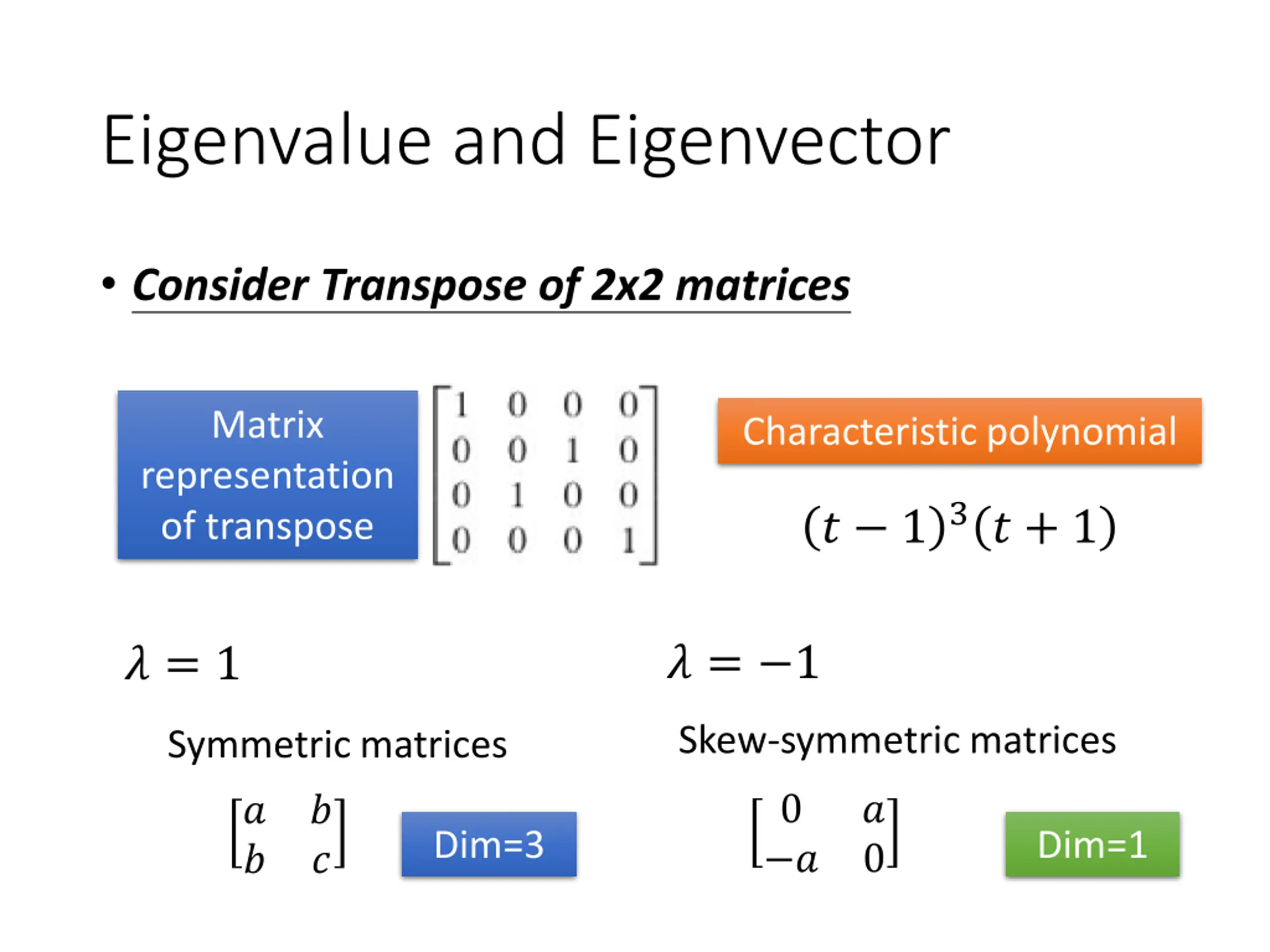 Eigenvalue and Eigenvector Consider Transpose of 2x2 matrices Matrix Characteristic polynomial representation of transpose ? 13? + 1 ? = 1 ? = 1 Skew-symmetric matrices Symmetric matrices 0 ? 0 ? ? ? ? Dim=3 Dim=1 ?