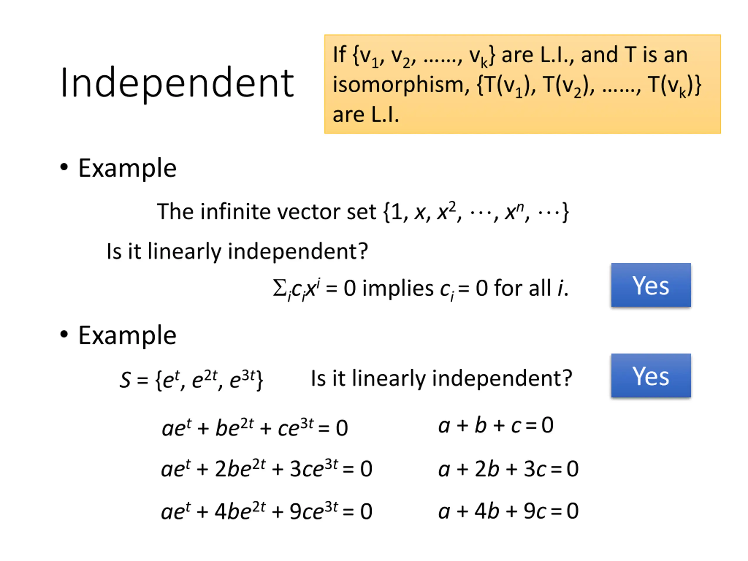 If {v1, v2, , vk} are L.I., and T is an isomorphism, {T(v1), T(v2), , T(vk)} are L.I. Independent Example The infinite vector set {1, x, x2, , xn, } Is it linearly independent? icixi= 0 implies ci = 0 for all i. Yes Example Yes Is it linearly independent? S = {et, e2t, e3t} a + b + c=0 aet+ be2t+ ce3t = 0 aet+ 2be2t+ 3ce3t = 0 a + 2b + 3c=0 aet+ 4be2t+ 9ce3t = 0 a + 4b + 9c=0