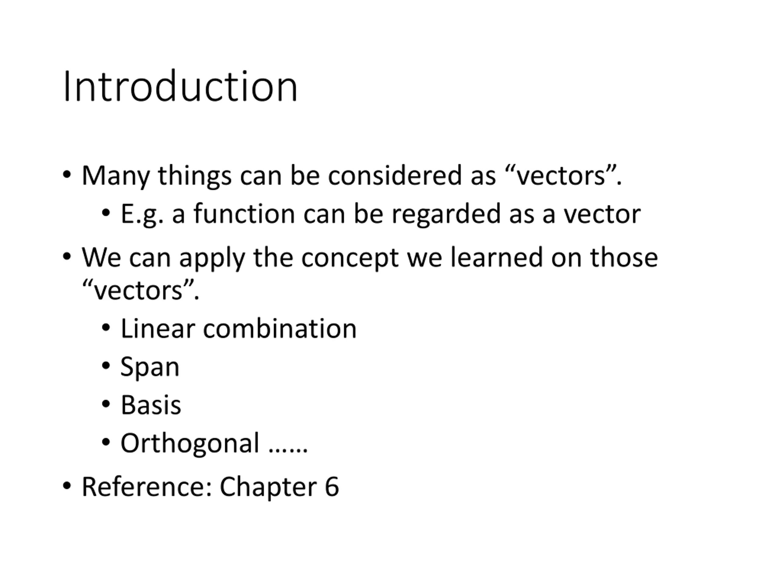 Introduction Many things can be considered as vectors . E.g. a function can be regarded as a vector We can apply the concept we learned on those vectors . Linear combination Span Basis Orthogonal Reference: Chapter 6