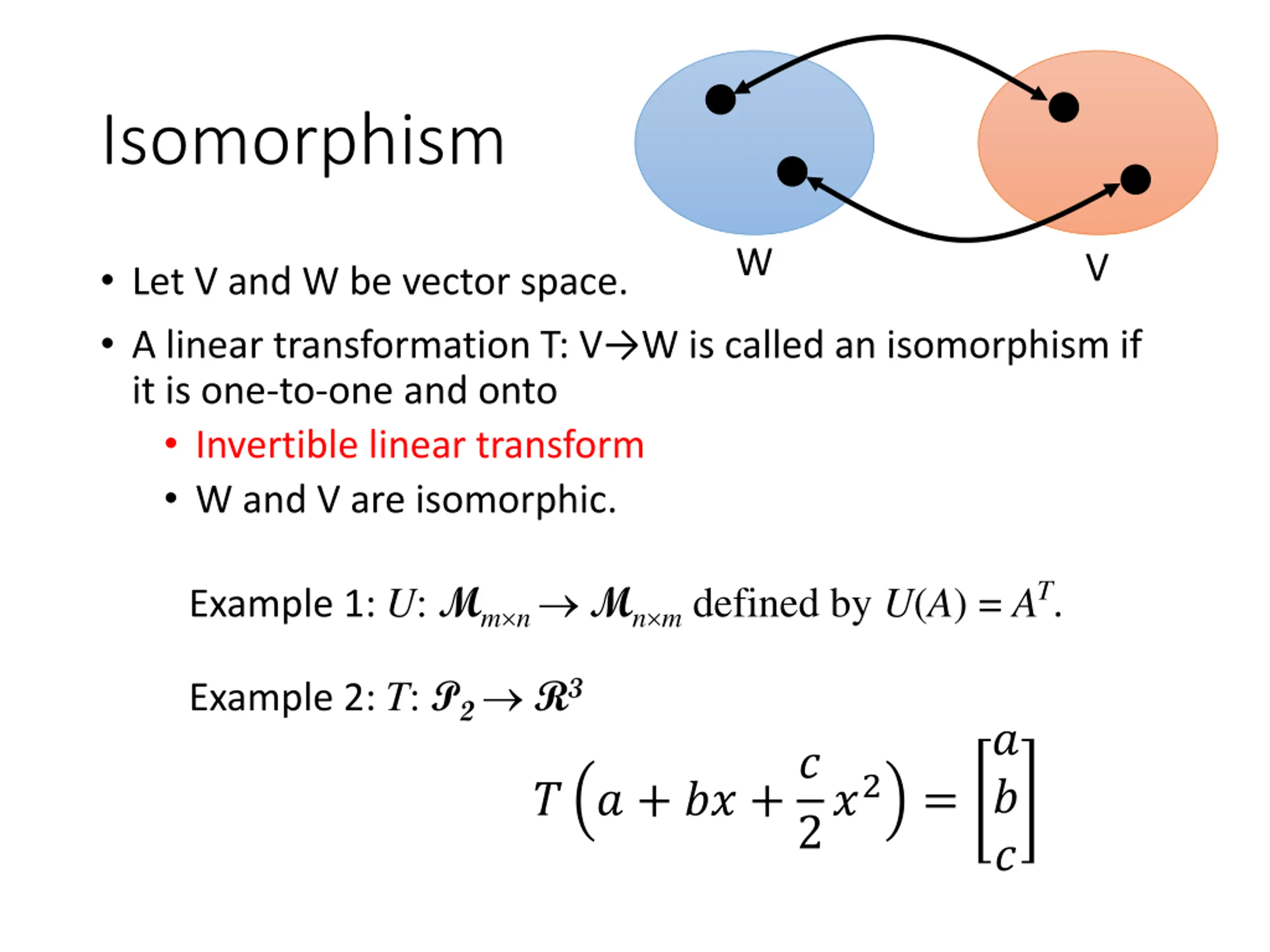 Isomorphism W V Let V and W be vector space. A linear transformation T: V W is called an isomorphism if it is one-to-one and onto Invertible linear transform W and V are isomorphic. Example 1: U: Mm n Mn mdefined by U(A) = AT. Example 2: T: P2 R3 ? ? ? ? ? + ?? +? 2?2=