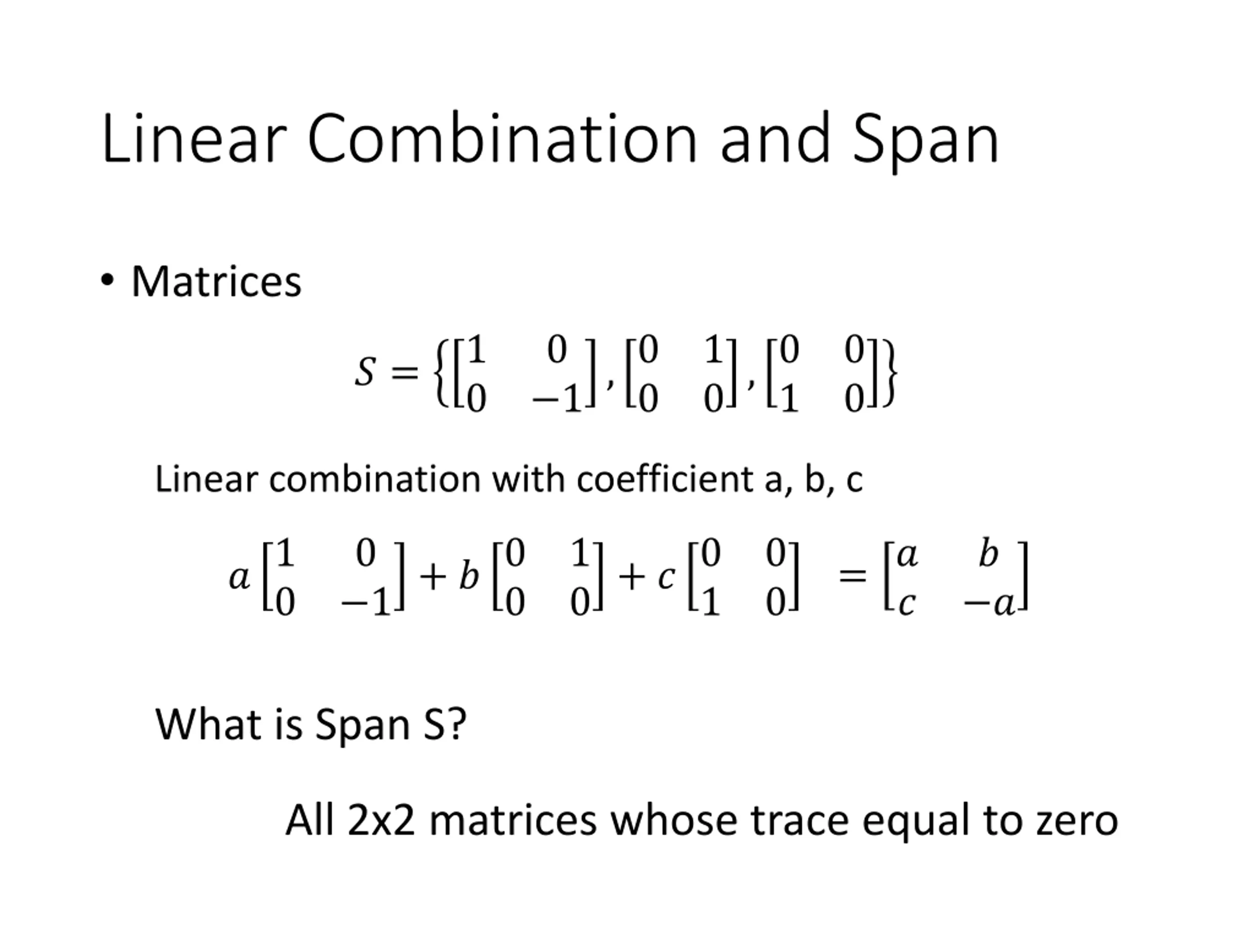 Linear Combination and Span Matrices 1 0 1,0 0 1 0,0 0 0 ? = 0 1 Linear combination with coefficient a, b, c =? ? ?1 1+ ?0 0 1 0+ ?0 0 0 ? ? 0 0 1 What is Span S? All 2x2 matrices whose trace equal to zero