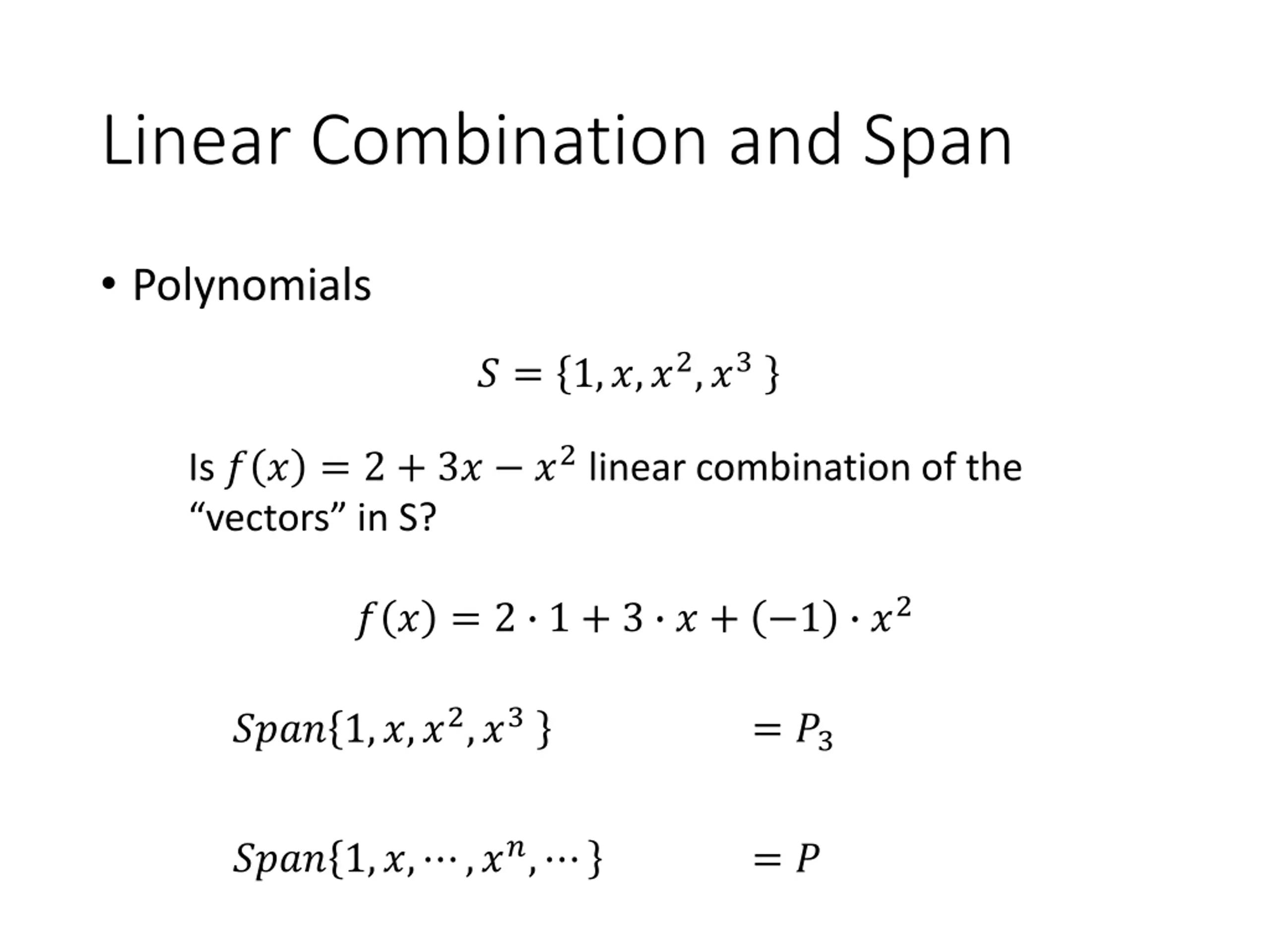 Linear Combination and Span Polynomials ? = 1,?,?2,?3 Is ? ? = 2 + 3? ?2 linear combination of the vectors in S? ? ? = 2 1 + 3 ? + 1 ?2 ???? 1,?,?2,?3 = ?3 ???? 1,?, ,??, = ?