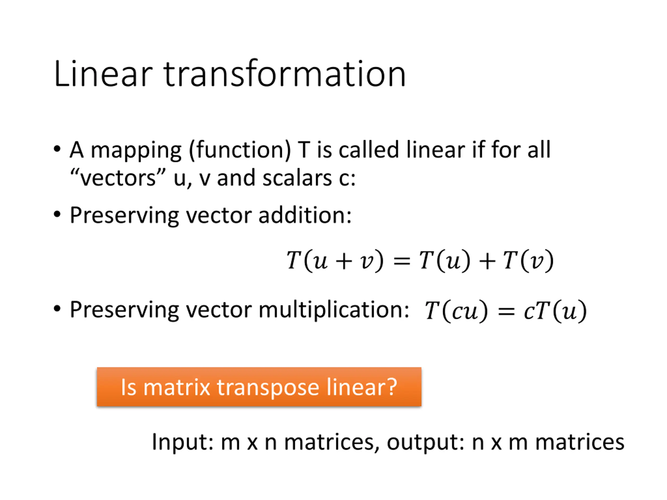 Linear transformation A mapping (function) T is called linear if for all vectors u, v and scalars c: Preserving vector addition: ? ? + ? = ? ? + ? ? Preserving vector multiplication: ? ?? = ?? ? Is matrix transpose linear? Input: m x n matrices, output: n x m matrices