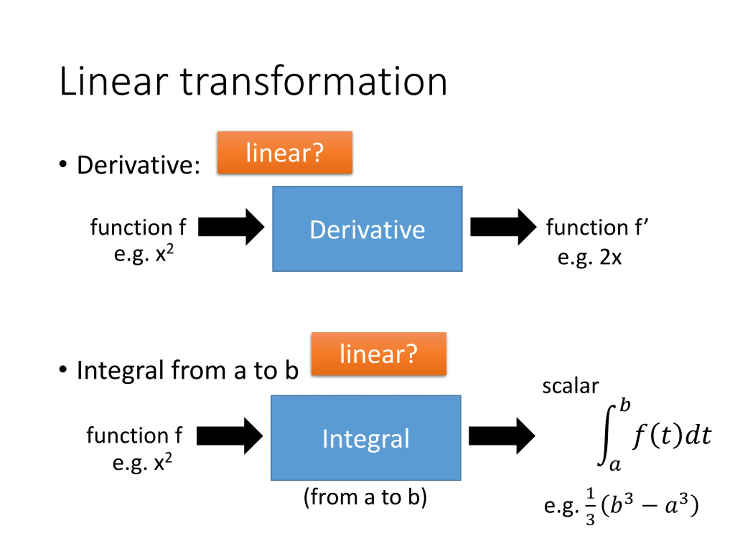Linear transformation linear? Derivative: function f e.g. 2x function f e.g. x2 Derivative linear? Integral from a to b scalar ? ? ? ?? function f e.g. x2 Integral ? e.g. 1 (from a to b) 3?3 ?3