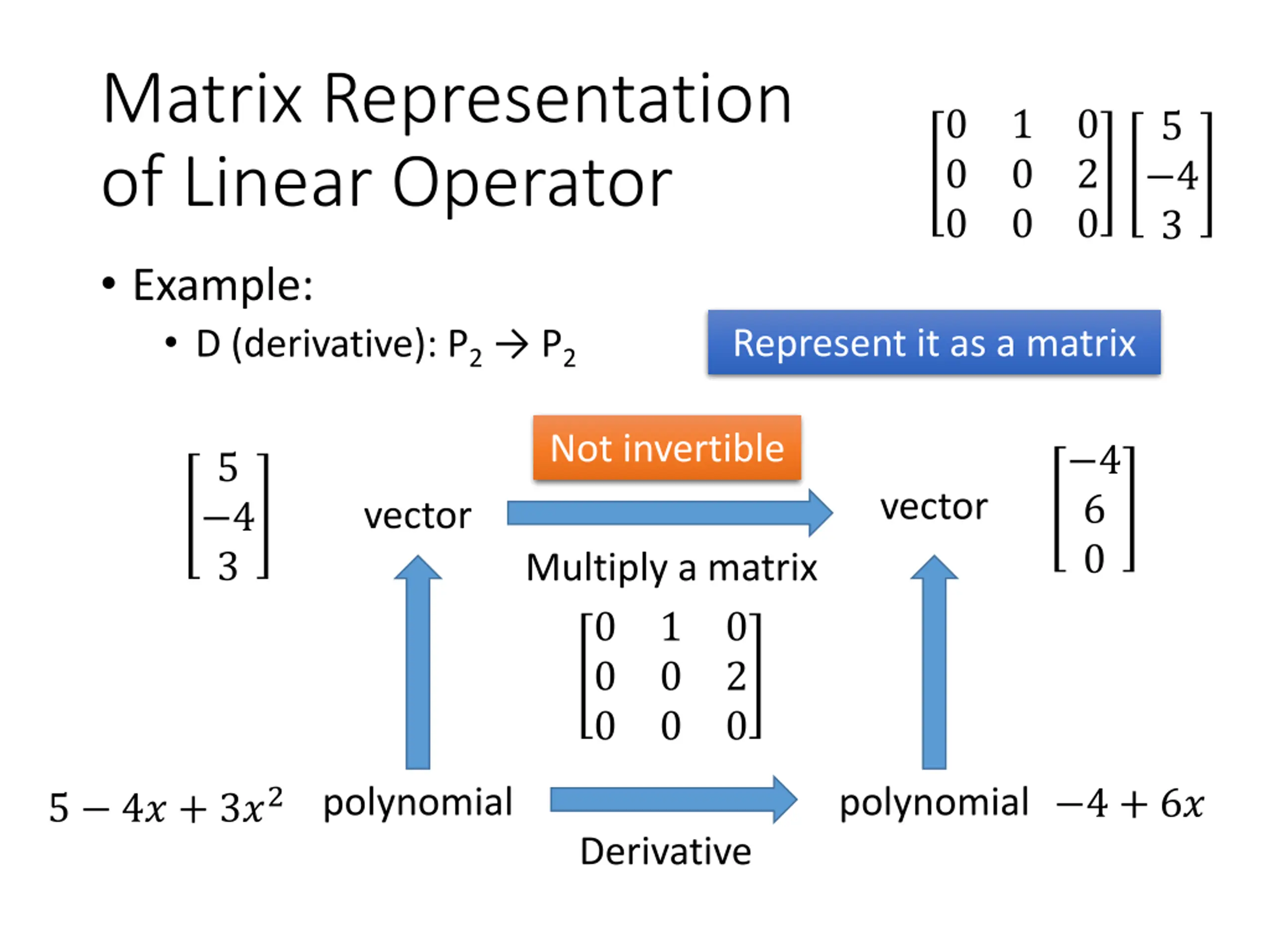 Matrix Representation of Linear Operator 0 0 0 1 0 0 0 2 0 5 4 3 Example: D (derivative): P2 P2 Represent it as a matrix Not invertible 4 6 0 5 vector vector 4 3 Multiply a matrix 0 1 0 0 0 0 0 2 0 5 4? + 3?2 polynomial polynomial 4 + 6? Derivative