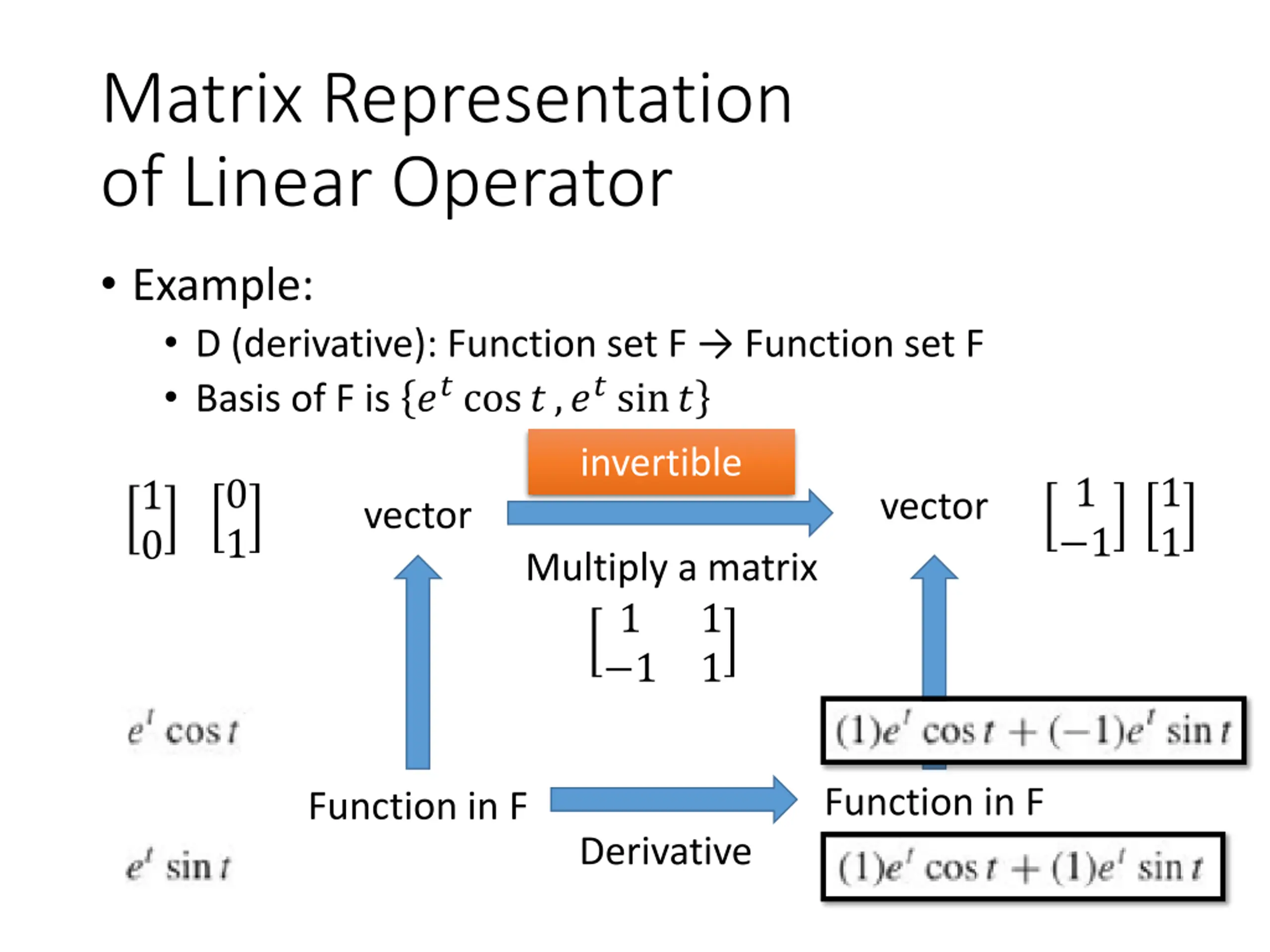Matrix Representation of Linear Operator Example: D (derivative): Function set F Function set F Basis of F is ??cos?,??sin? invertible 1 1 1 0 1 1 0 vector vector 1 Multiply a matrix 1 1 1 1 Function in F Function in F Derivative