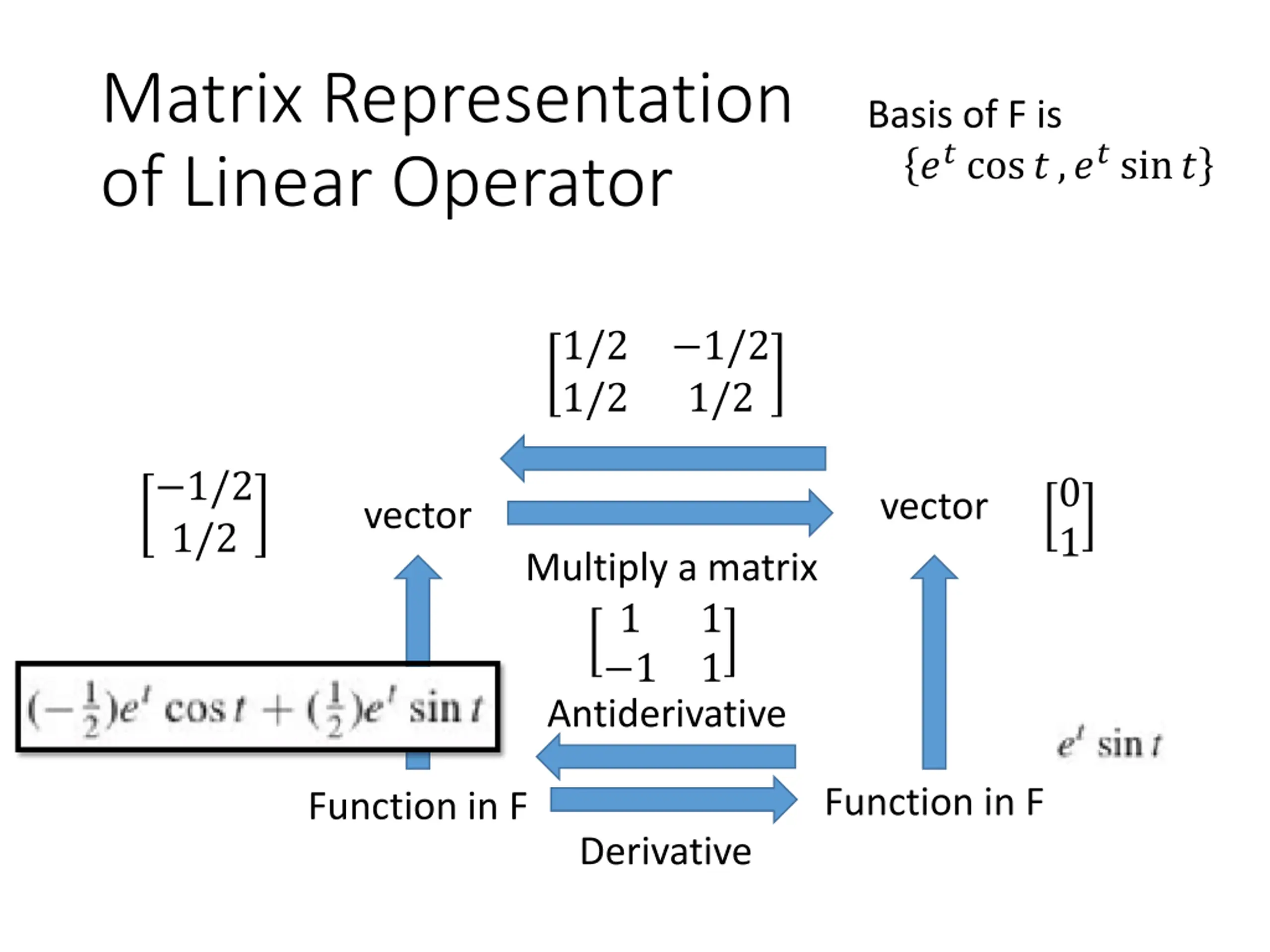 Matrix Representation of Linear Operator Basis of F is ??cos?,??sin? 1/2 1/2 1/2 1/2 1/2 1/2 0 1 vector vector Multiply a matrix 1 1 Antiderivative 1 1 Function in F Function in F Derivative