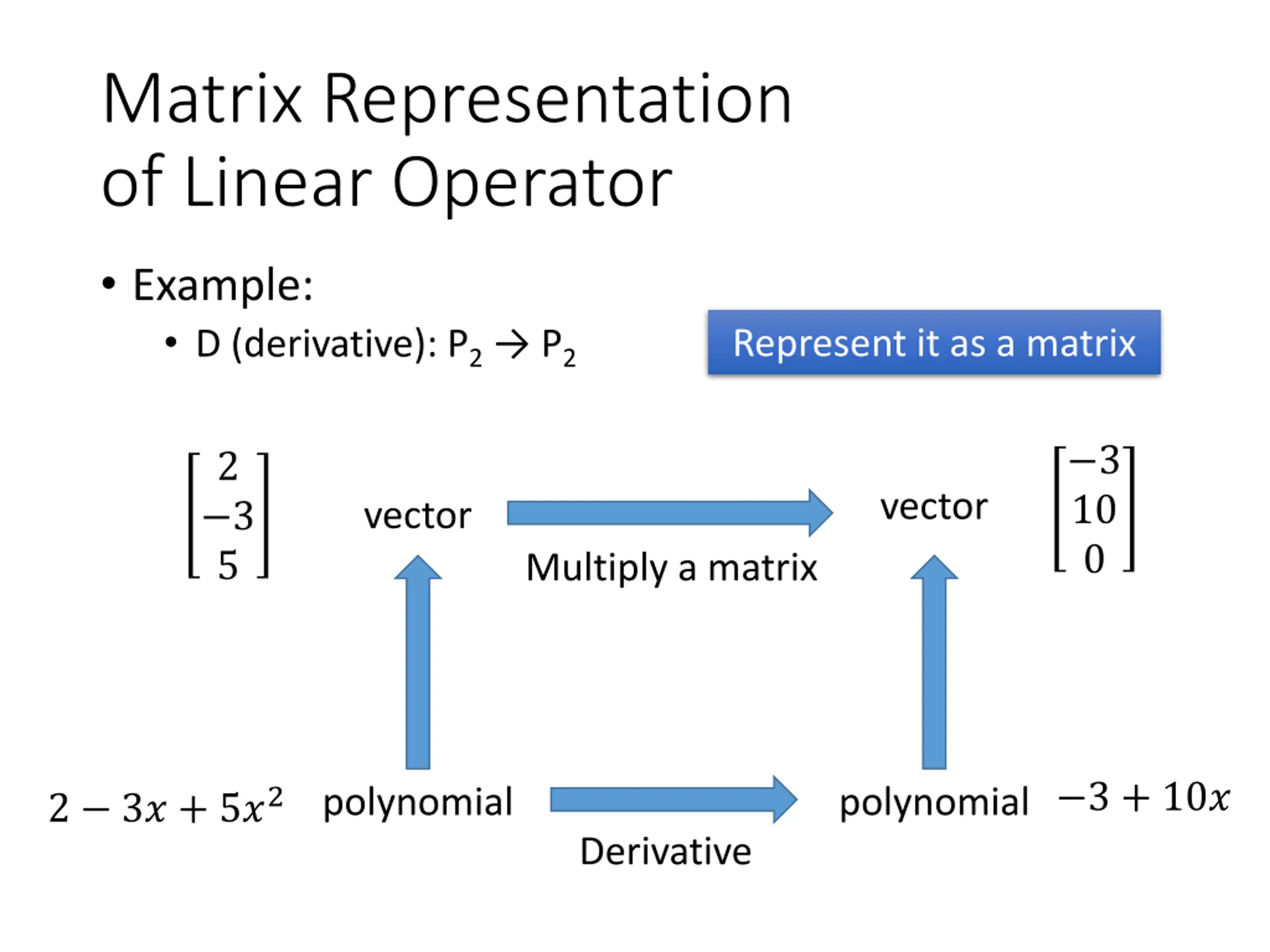 Matrix Representation of Linear Operator Example: D (derivative): P2 P2 Represent it as a matrix 3 10 0 2 vector vector 3 5 Multiply a matrix 3 + 10? 2 3? + 5?2 polynomial polynomial Derivative