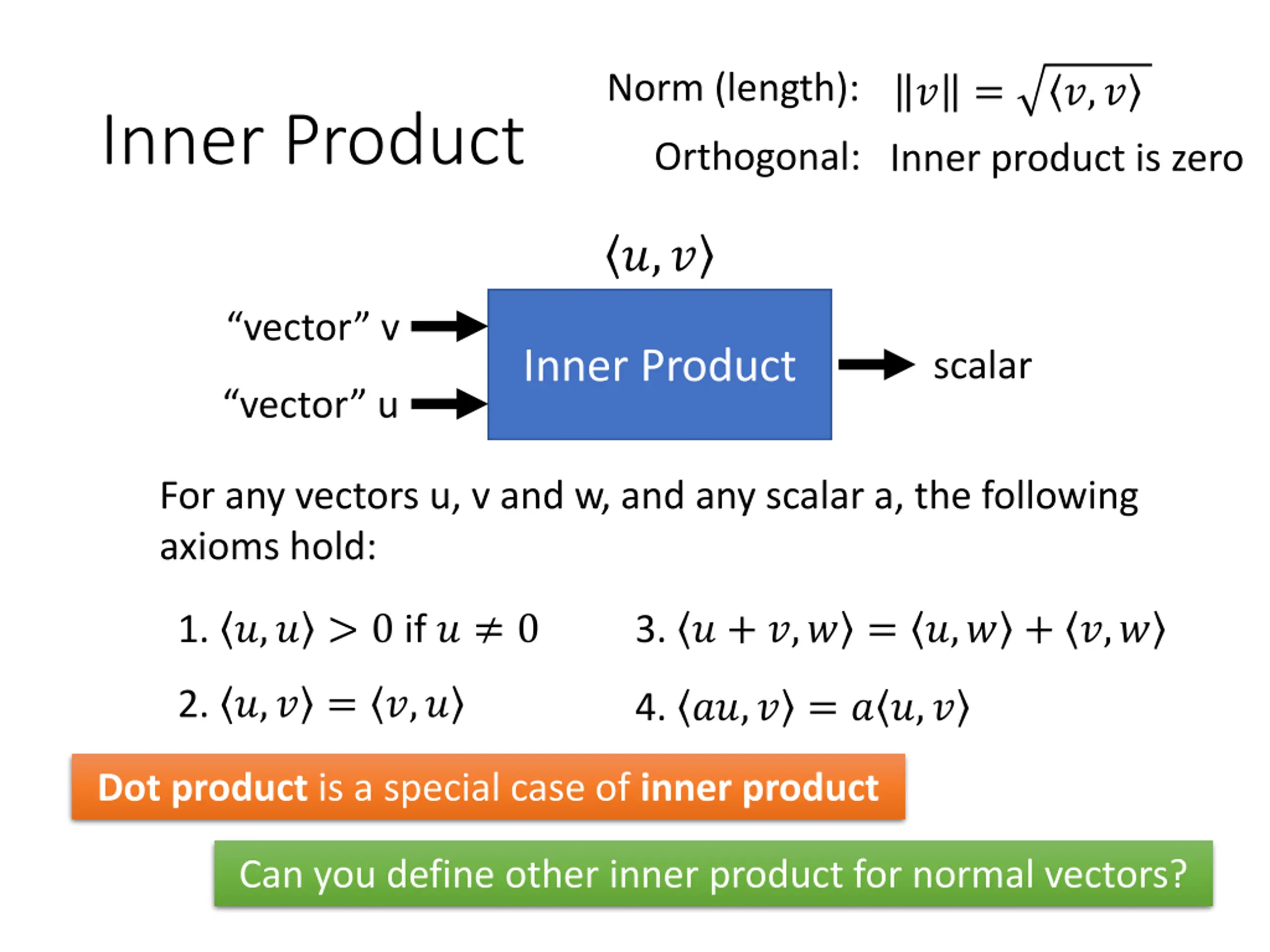 Norm (length): ? = ?,? Inner Product Orthogonal: Inner product is zero ?,? vector v Inner Product scalar vector u For any vectors u, v and w, and any scalar a, the following axioms hold: 3. ? + ?,? = ?,? + ?,? 1. ?,? > 0 if ? 0 2. ?,? = ?,? 4. ??,? = ? ?,? Dot product is a special case of inner product Can you define other inner product for normal vectors?
