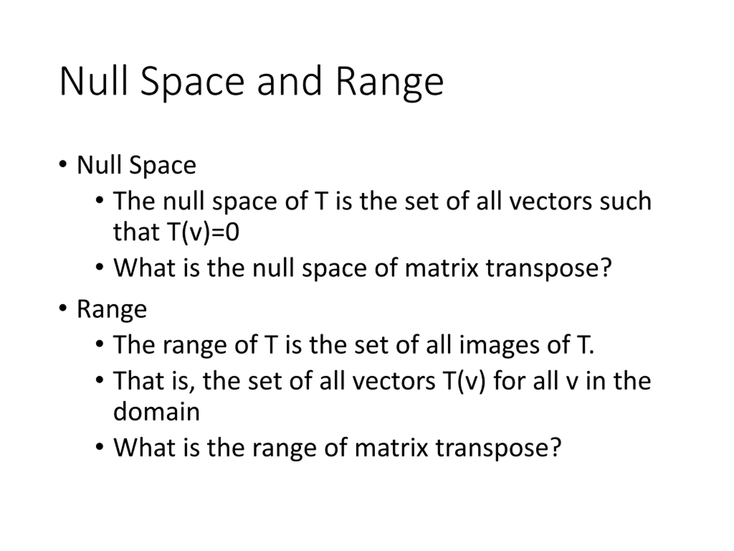 Null Space and Range Null Space The null space of T is the set of all vectors such that T(v)=0 What is the null space of matrix transpose? Range The range of T is the set of all images of T. That is, the set of all vectors T(v) for all v in the domain What is the range of matrix transpose?
