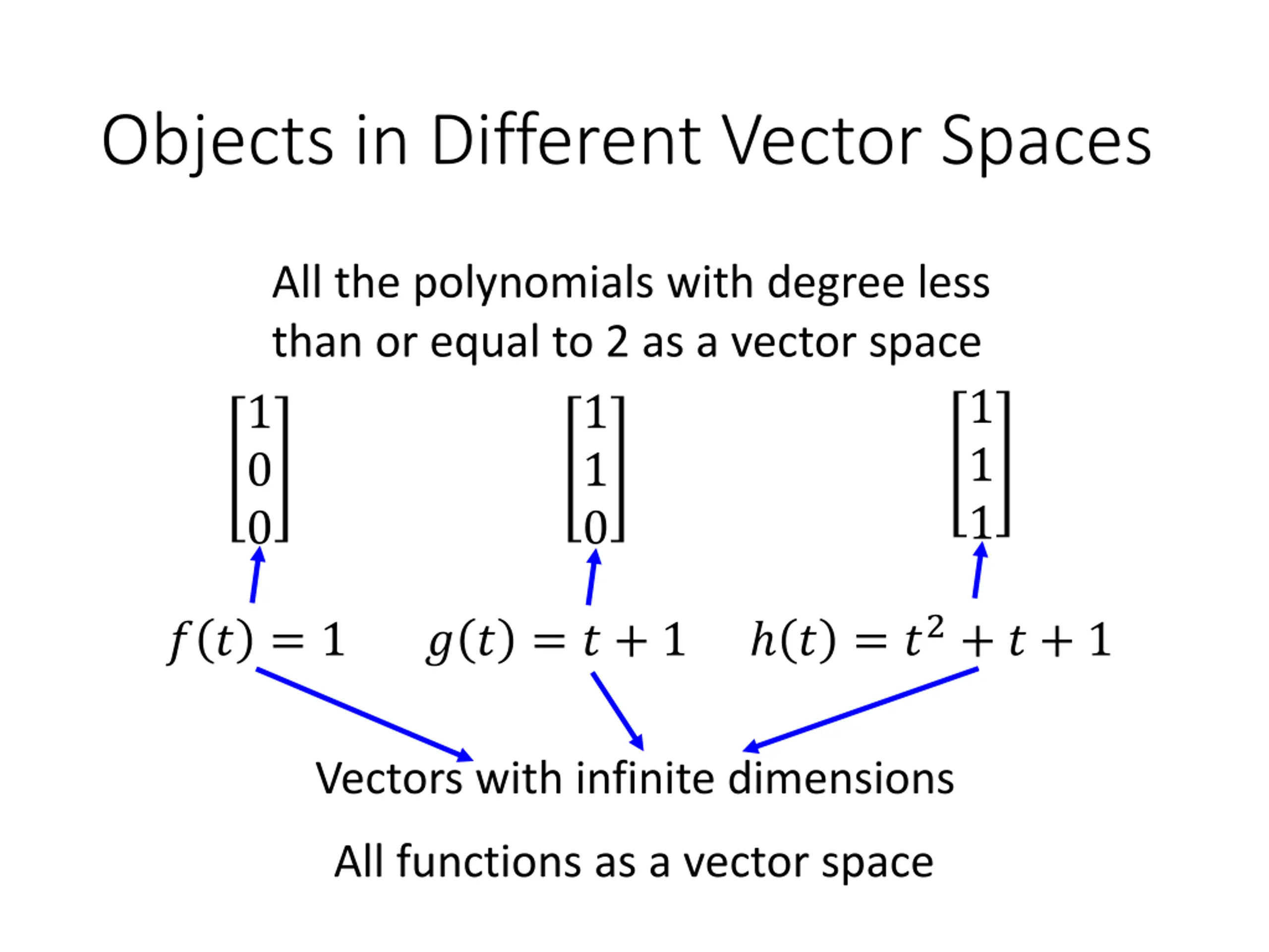 Objects in Different Vector Spaces All the polynomials with degree less than or equal to 2 as a vector space 1 0 0 0 1 1 1 1 1 ? = ?2+ ? + 1 ? ? = 1 ? ? = ? + 1 Vectors with infinite dimensions All functions as a vector space