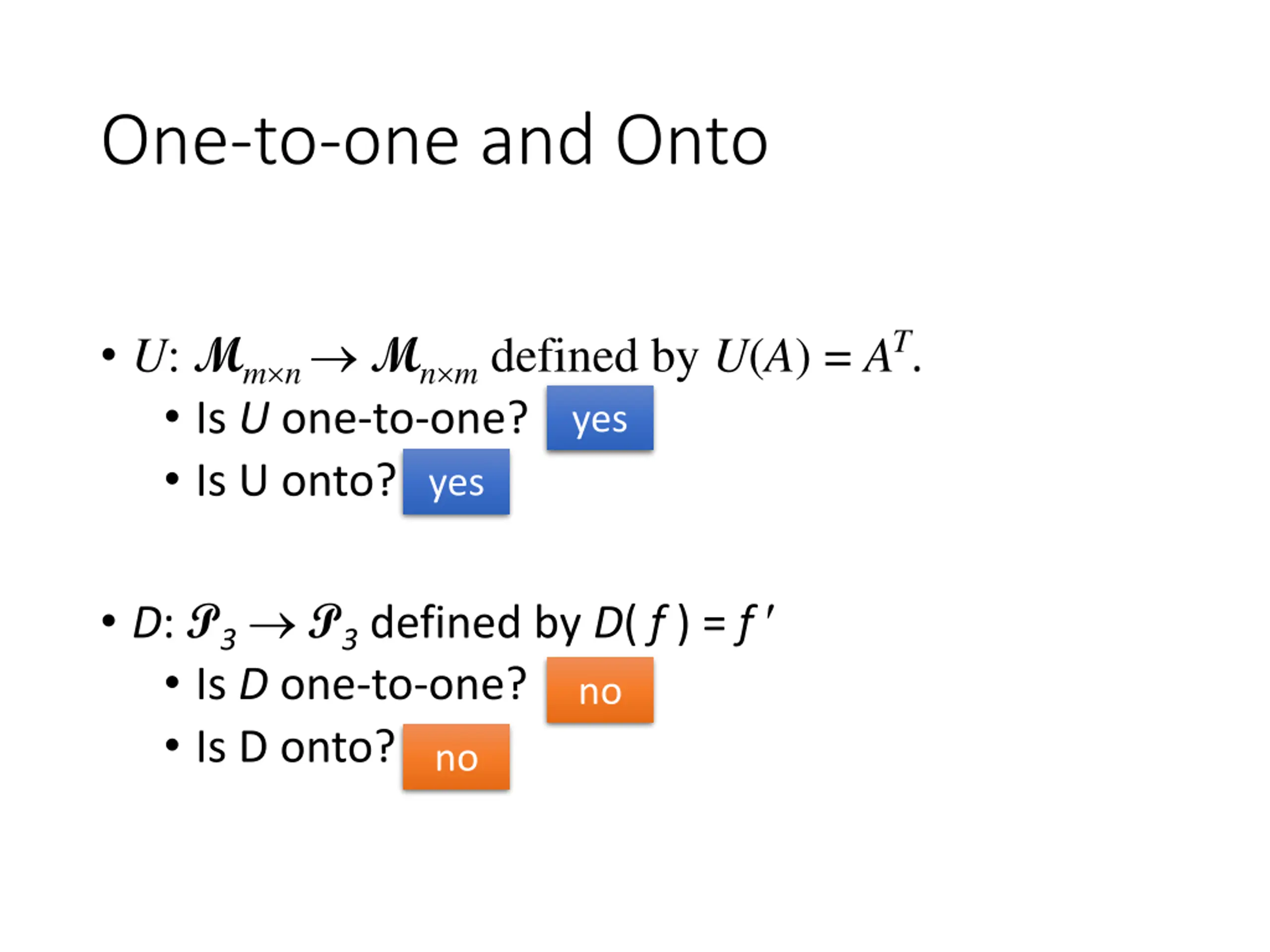 One-to-one and Onto U: Mm n Mn mdefined by U(A) = AT. Is U one-to-one? Is U onto? yes yes D: P3 P3defined by D( f ) = f Is D one-to-one? Is D onto? no no