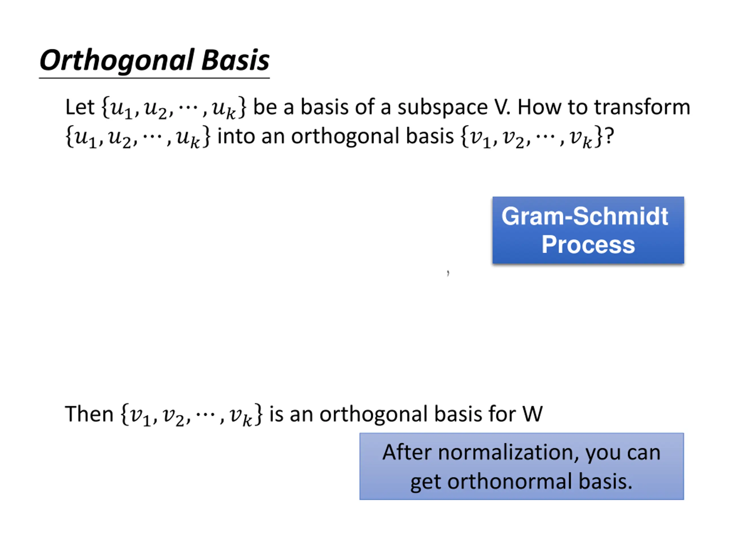 Orthogonal Basis Let ?1,?2, ,?? be a basis of a subspace V. How to transform ?1,?2, ,?? into an orthogonal basis ?1,?2, ,??? Gram-Schmidt Process Then ?1,?2, ,?? is an orthogonal basis for W After normalization, you can get orthonormal basis.