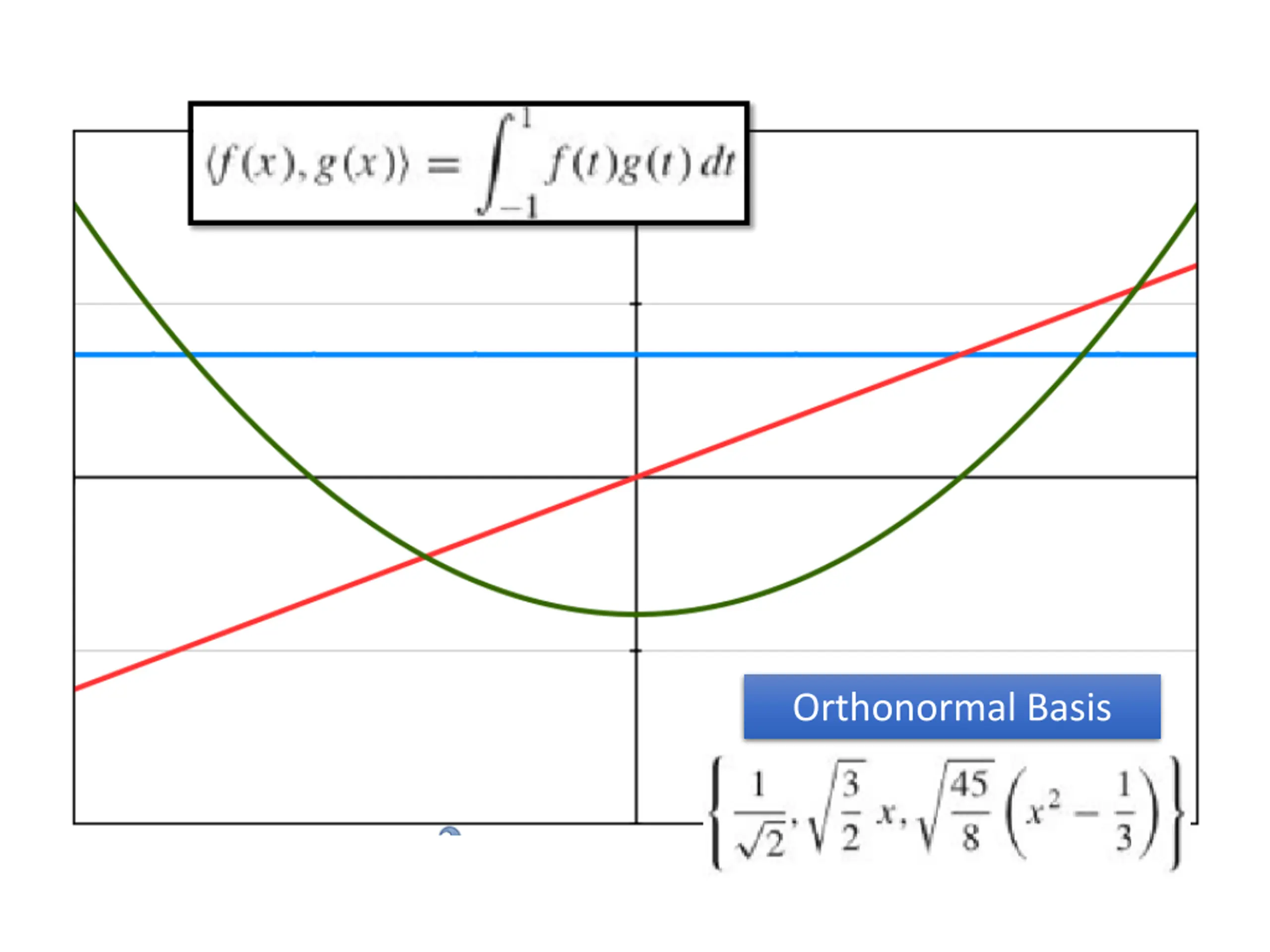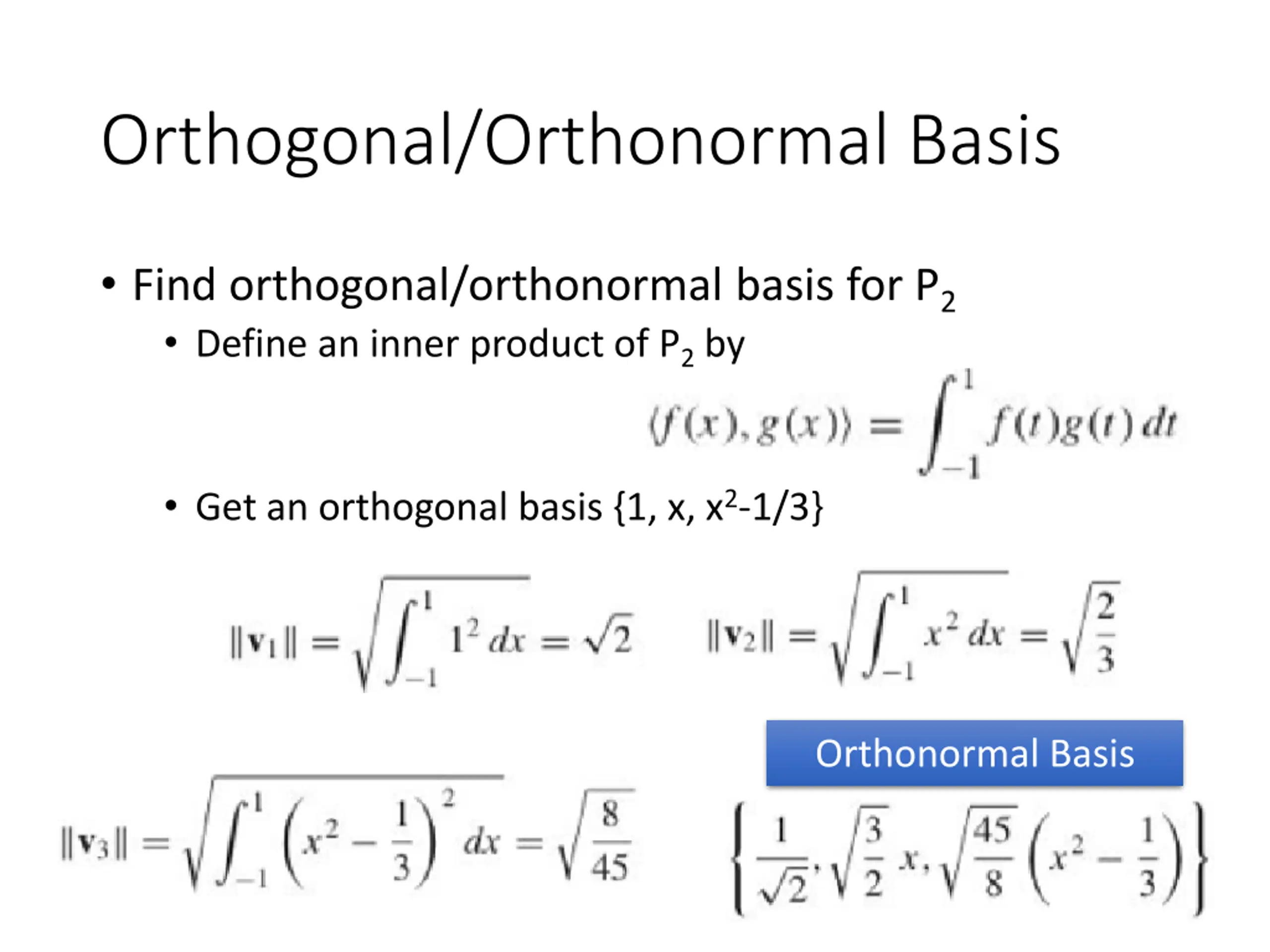 Orthogonal/Orthonormal Basis Find orthogonal/orthonormal basis for P2 Define an inner product of P2by Get an orthogonal basis {1, x, x2-1/3} Orthonormal Basis