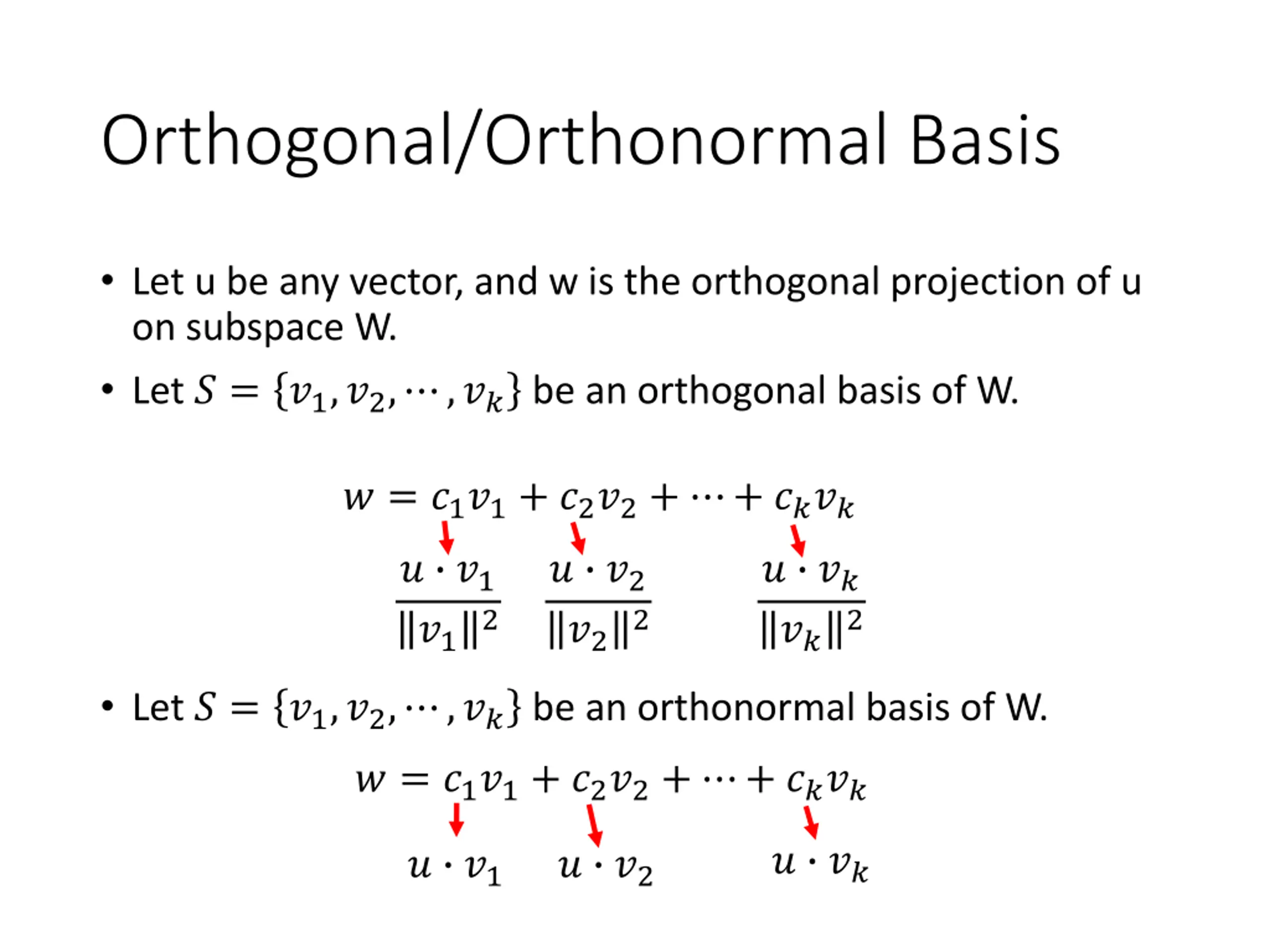 Orthogonal/Orthonormal Basis Let u be any vector, and w is the orthogonal projection of u on subspace W. Let ? = ?1,?2, ,?? be an orthogonal basis of W. ? = ?1?1+ ?2?2+ + ???? ? ?1 ?1 ? ?2 ?2 ? ?? ?? 2 2 2 Let ? = ?1,?2, ,?? be an orthonormal basis of W. ? = ?1?1+ ?2?2+ + ???? ? ?? ? ?1 ? ?2