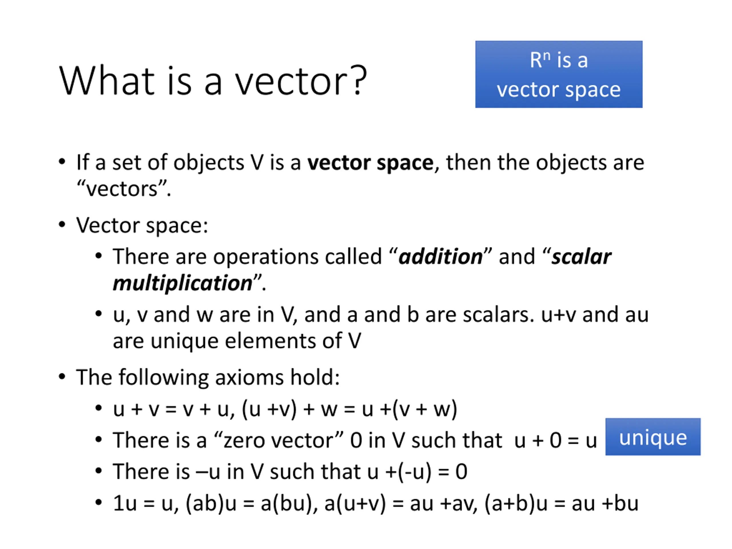 Rnis a What is a vector? vector space If a set of objects V is a vector space, then the objects are vectors . Vector space: There are operations called addition and scalar multiplication . u, v and w are in V, and a and b are scalars. u+v and au are unique elements of V The following axioms hold: u + v = v + u, (u +v) + w = u +(v + w) There is a zero vector 0 in V such that u + 0 = u There is u in V such that u +(-u) = 0 1u = u, (ab)u = a(bu), a(u+v) = au +av, (a+b)u = au +bu unique