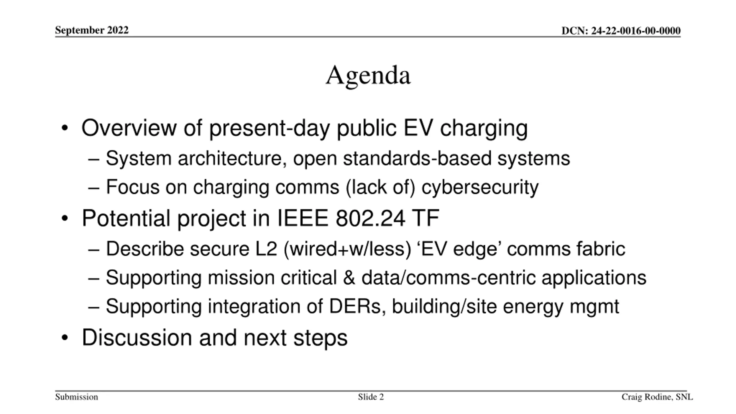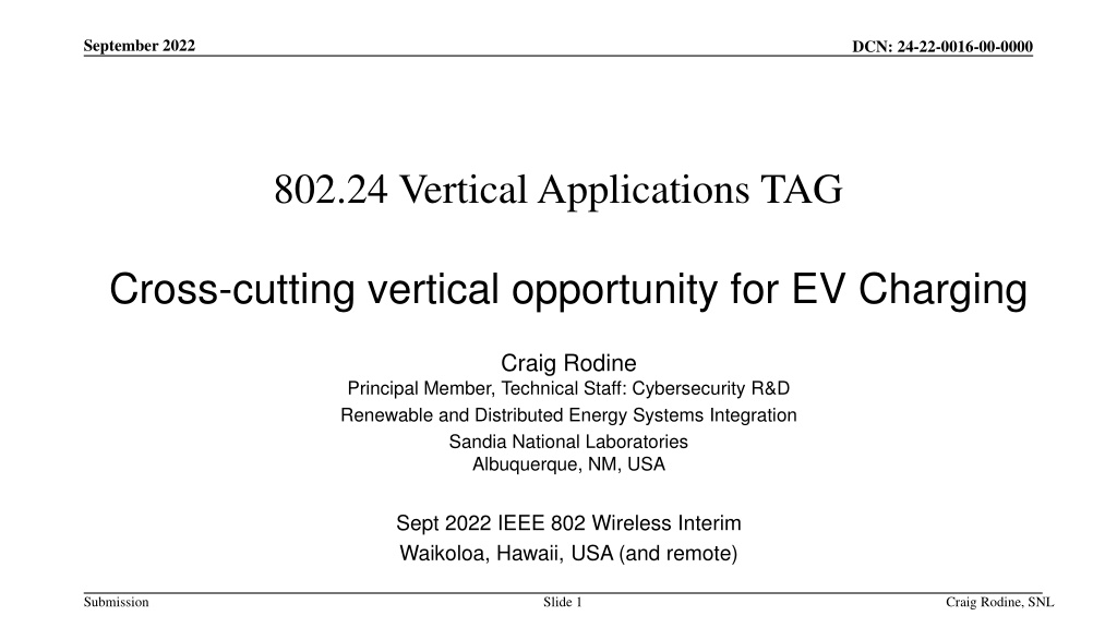 September 2022 DCN: 24-22-0016-00-0000 802.24 Vertical Applications TAG Cross-cutting vertical opportunity for EV Charging Craig Rodine Principal Member, Technical Staff: Cybersecurity R&D Renewable and Distributed Energy Systems Integration Sandia National Laboratories Albuquerque, NM, USA Sept 2022 IEEE 802 Wireless Interim Waikoloa, Hawaii, USA (and remote) Submission Slide 1 Craig Rodine, SNL