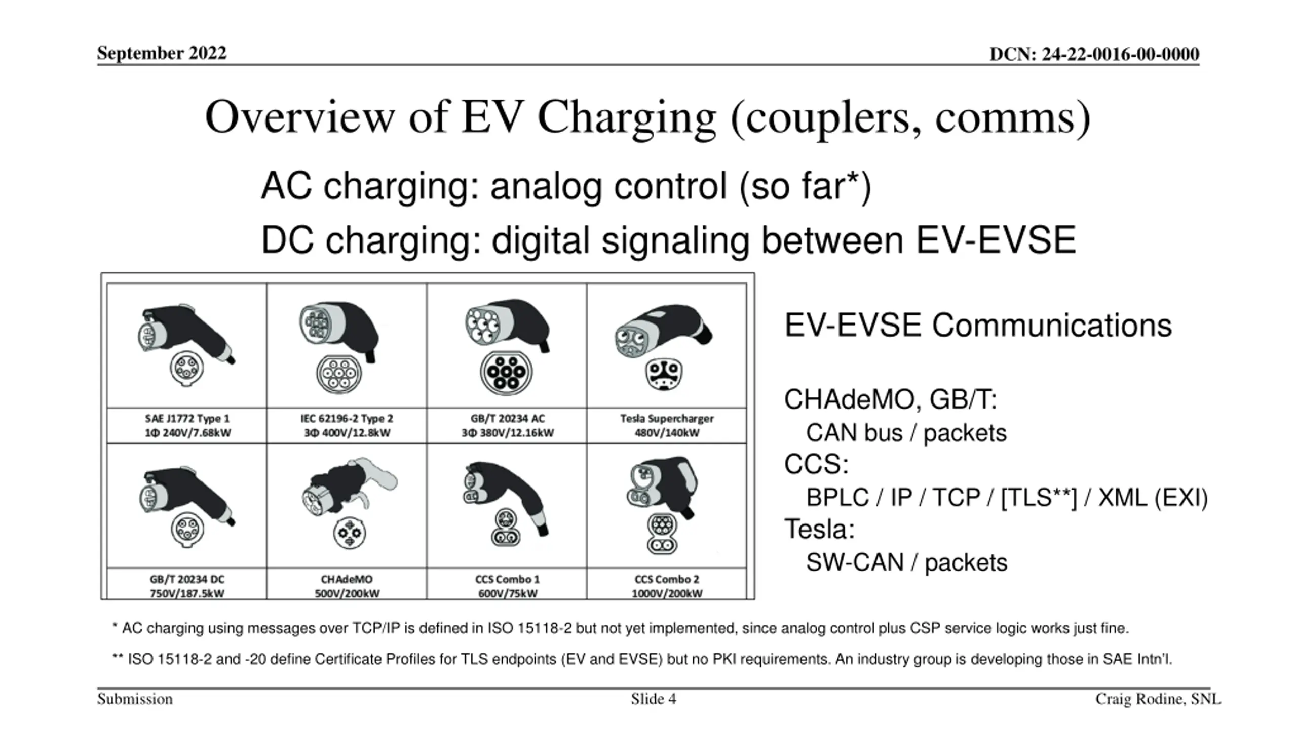 September 2022 DCN: 24-22-0016-00-0000 Overview of EV Charging (systems, services) OEM2 cloud CNO2 cloud MSP2 cloud MSP1 cloud OEM1 cloud CNO1 cloud Foundation: safe energy exchange via coupler (connector+inlet), controlled by communication between state machines in EV and EVSE. Submission Slide 3 Craig Rodine, SNL