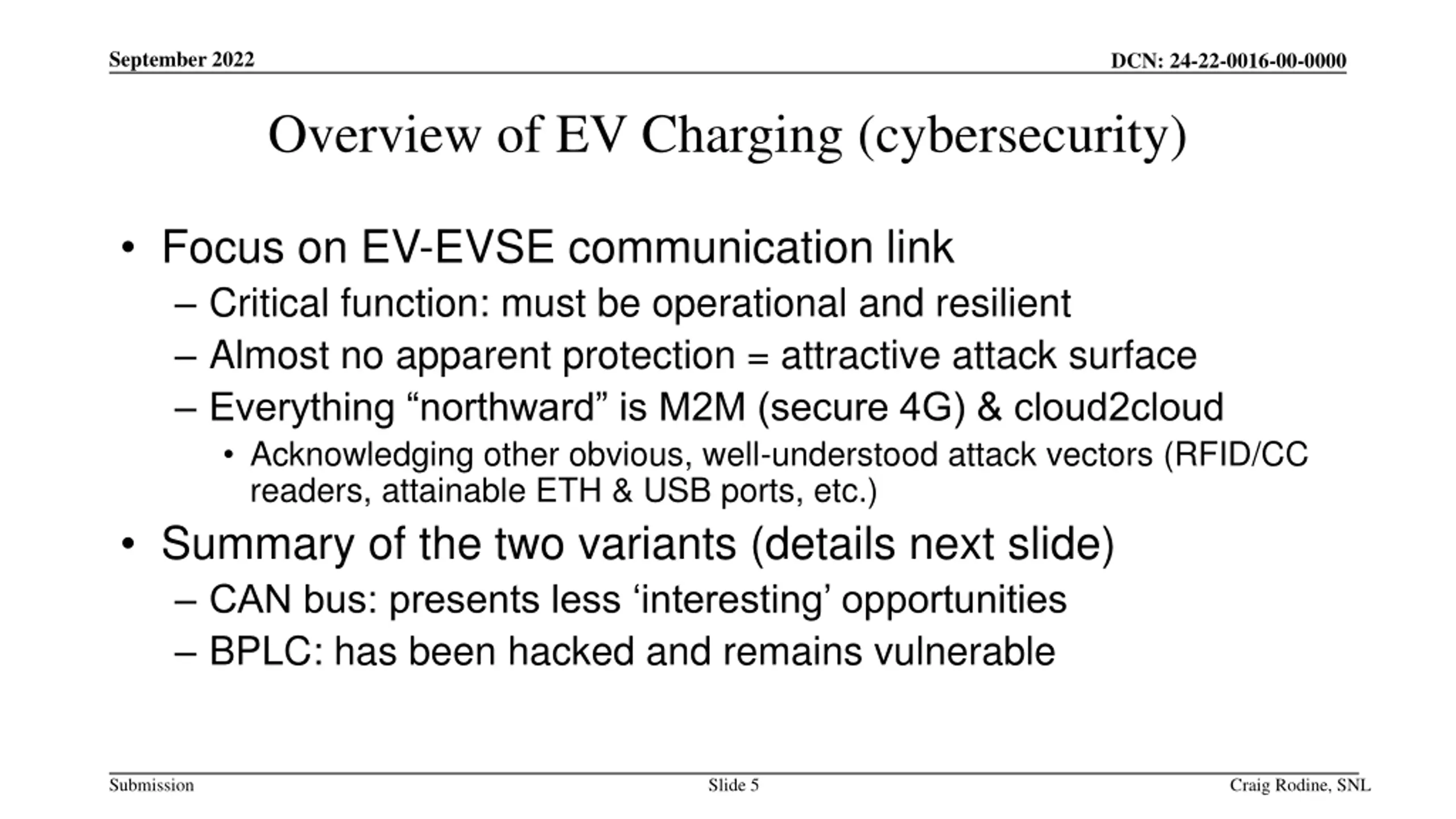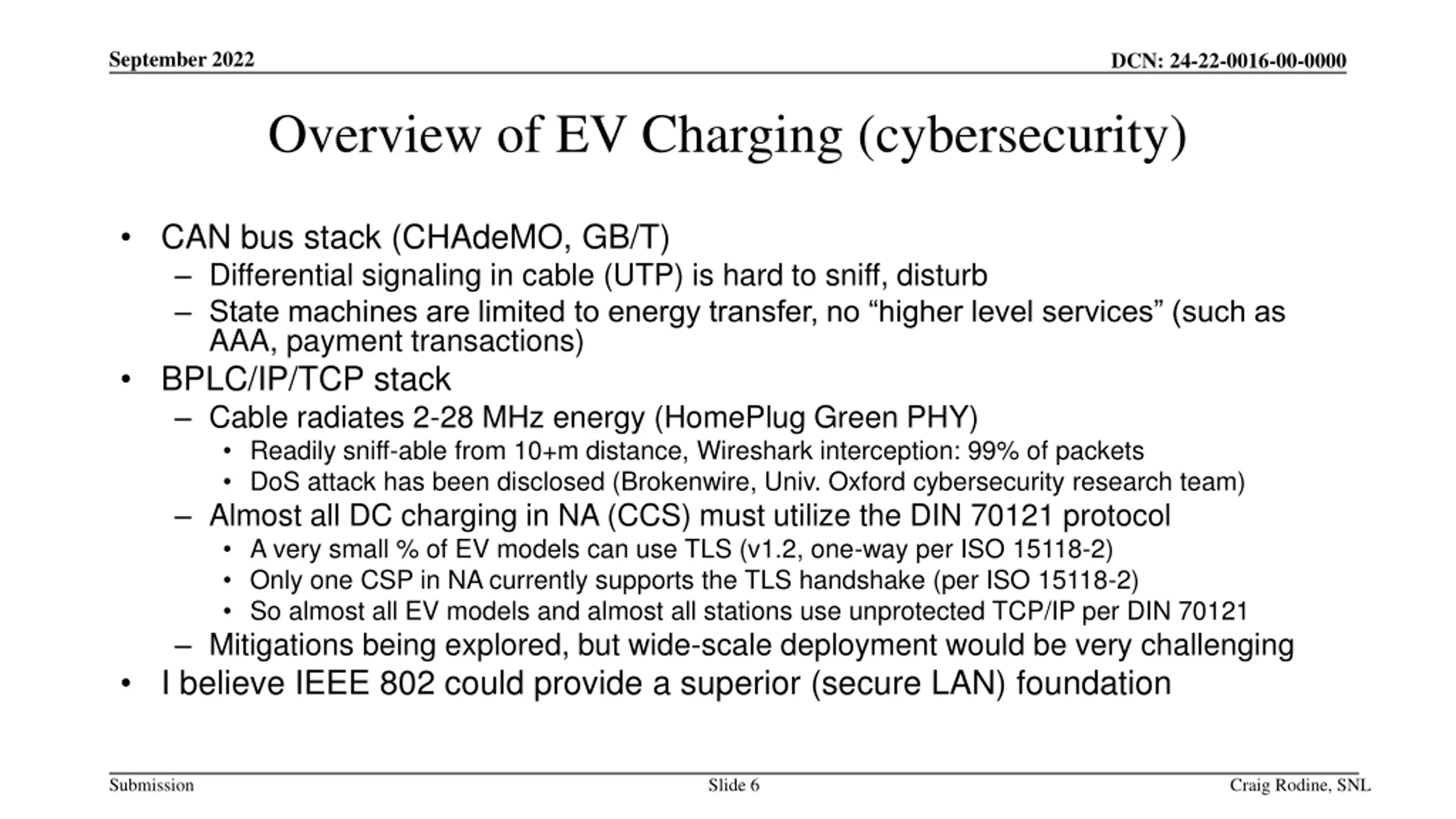September 2022 DCN: 24-22-0016-00-0000 Overview of EV Charging (cybersecurity) Focus on EV-EVSE communication link Critical function: must be operational and resilient Almost no apparent protection = attractive attack surface Everything northward is M2M (secure 4G) & cloud2cloud Acknowledging other obvious, well-understood attack vectors (RFID/CC readers, attainable ETH & USB ports, etc.) Summary of the two variants (details next slide) CAN bus: presents less interesting opportunities BPLC: has been hacked and remains vulnerable Submission Slide 5 Craig Rodine, SNL