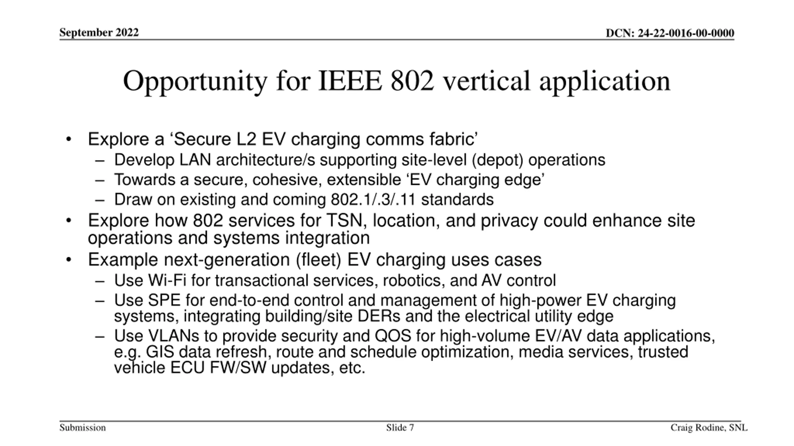 September 2022 DCN: 24-22-0016-00-0000 Overview of EV Charging (cybersecurity) CAN bus stack (CHAdeMO, GB/T) Differential signaling in cable (UTP) is hard to sniff, disturb State machines are limited to energy transfer, no higher level services (such as AAA, payment transactions) BPLC/IP/TCP stack Cable radiates 2-28 MHz energy (HomePlug Green PHY) Readily sniff-able from 10+m distance, Wireshark interception: 99% of packets DoS attack has been disclosed (Brokenwire, Univ. Oxford cybersecurity research team) Almost all DC charging in NA (CCS) must utilize the DIN 70121 protocol A very small % of EV models can use TLS (v1.2, one-way per ISO 15118-2) Only one CSP in NA currently supports the TLS handshake (per ISO 15118-2) So almost all EV models and almost all stations use unprotected TCP/IP per DIN 70121 Mitigations being explored, but wide-scale deployment would be very challenging I believe IEEE 802 could provide a superior (secure LAN) foundation Submission Slide 6 Craig Rodine, SNL