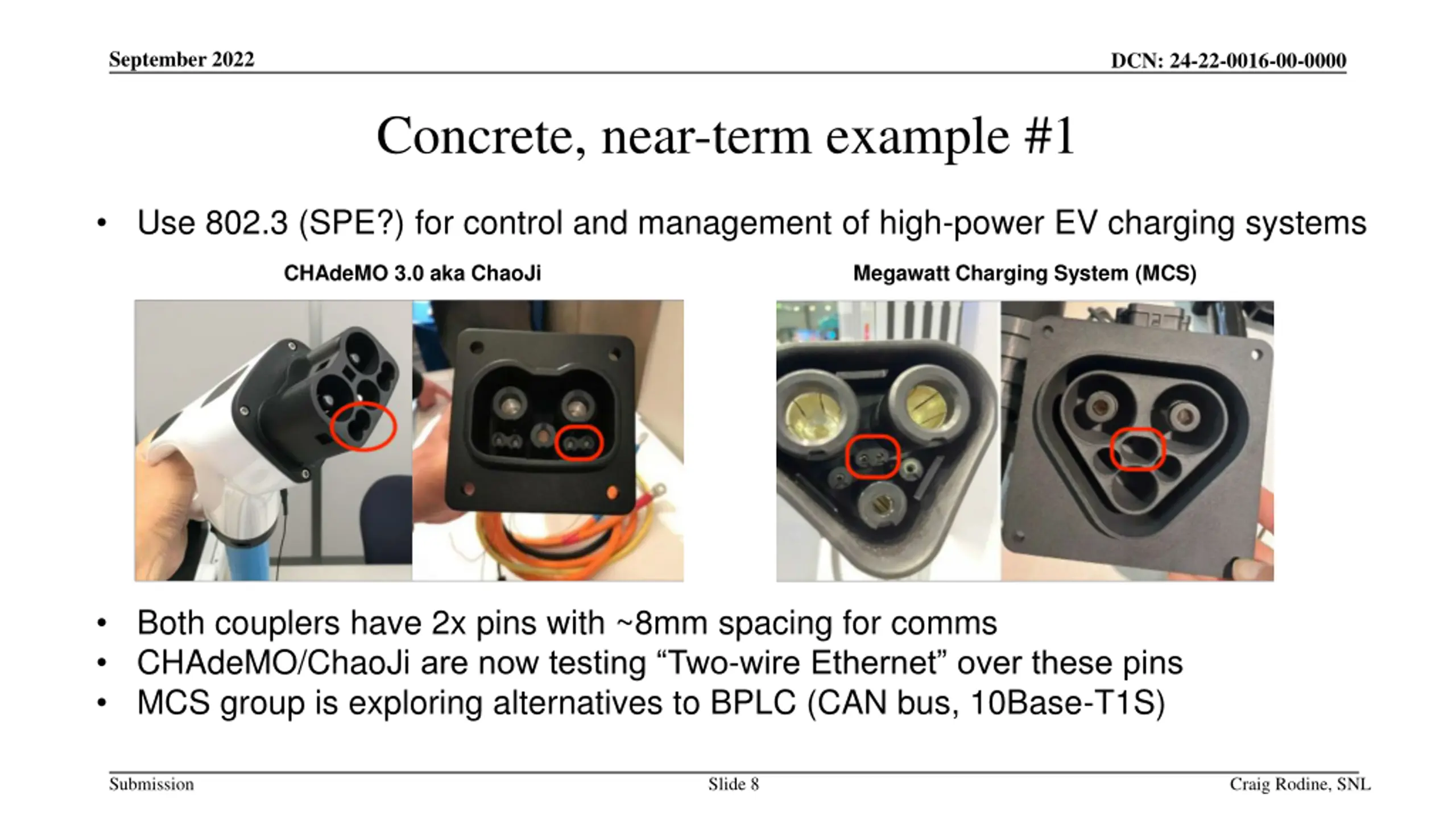 September 2022 DCN: 24-22-0016-00-0000 Concrete, near-term example #1 Use 802.3 (SPE?) for control and management of high-power EV charging systems CHAdeMO 3.0 aka ChaoJi Megawatt Charging System (MCS) Both couplers have 2x pins with ~8mm spacing for comms CHAdeMO/ChaoJi are now testing Two-wire Ethernet over these pins MCS group is exploring alternatives to BPLC (CAN bus, 10Base-T1S) Submission Slide 8 Craig Rodine, SNL