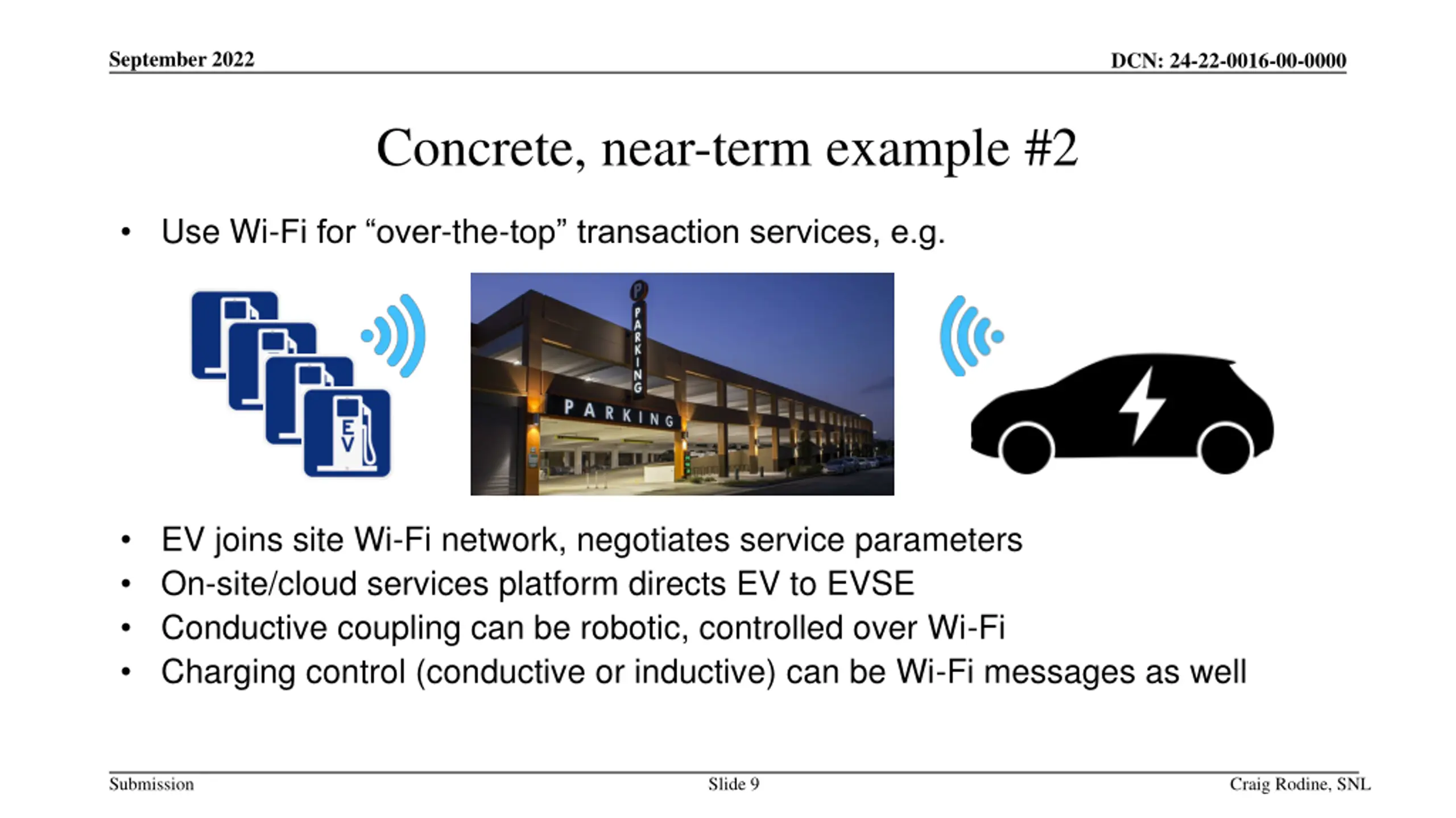 September 2022 DCN: 24-22-0016-00-0000 Concrete, near-term example #2 Use Wi-Fi for over-the-top transaction services, e.g. EV joins site Wi-Fi network, negotiates service parameters On-site/cloud services platform directs EV to EVSE Conductive coupling can be robotic, controlled over Wi-Fi Charging control (conductive or inductive) can be Wi-Fi messages as well Submission Slide 9 Craig Rodine, SNL