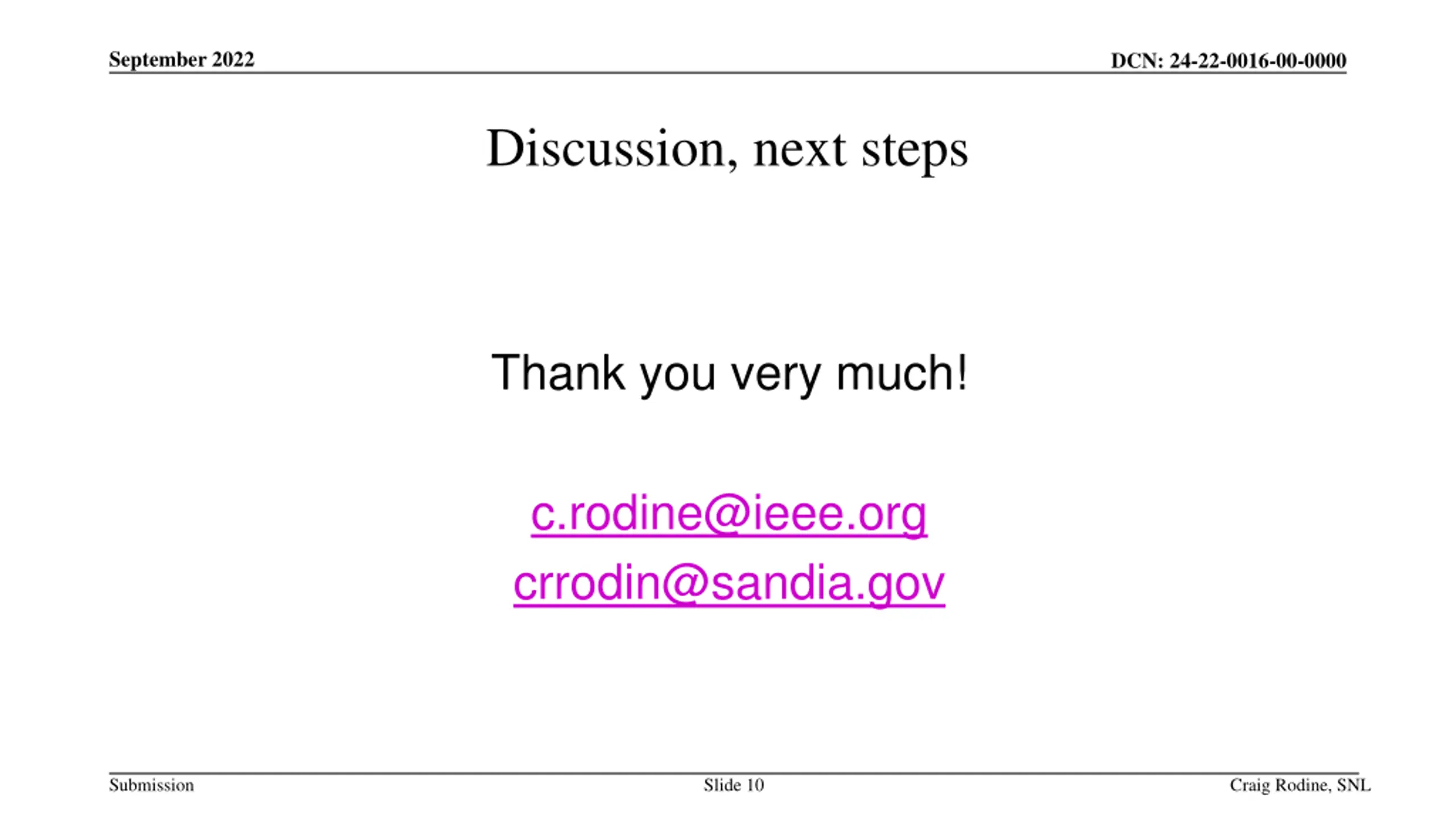 September 2022 DCN: 24-22-0016-00-0000 Discussion, next steps Thank you very much! c.rodine@ieee.org crrodin@sandia.gov Submission Slide 10 Craig Rodine, SNL