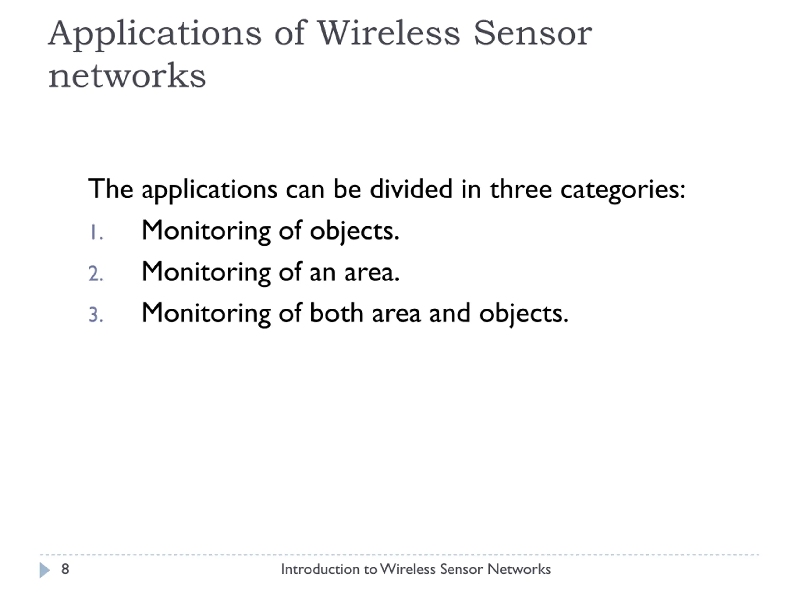 Applications of Wireless Sensor networks The applications can be divided in three categories: Monitoring of objects. Monitoring of an area. Monitoring of both area and objects. 1. 2. 3. 8 Introduction to Wireless Sensor Networks