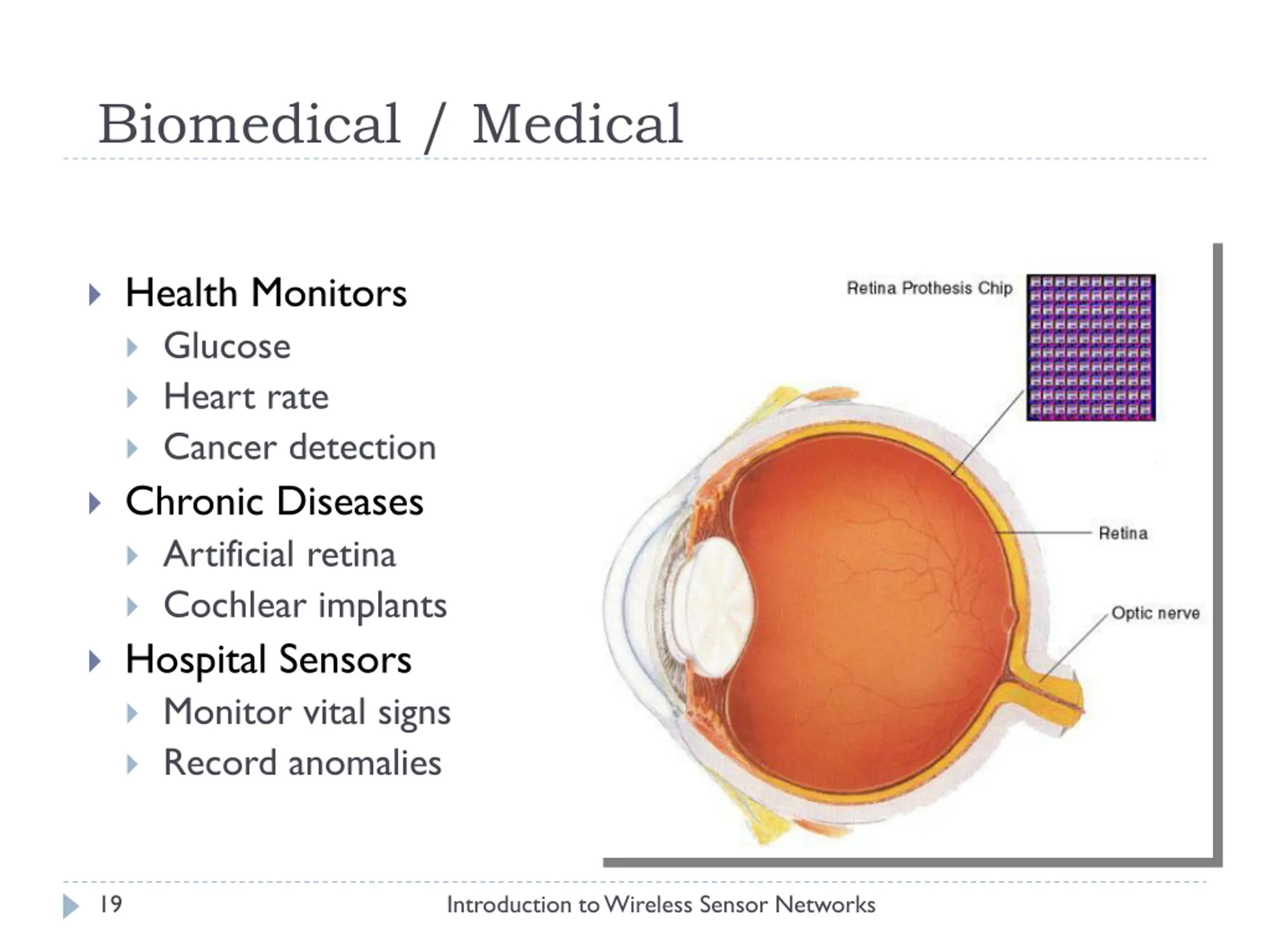 Biomedical / Medical Health Monitors Glucose Heart rate Cancer detection Chronic Diseases Artificial retina Cochlear implants Hospital Sensors Monitor vital signs Record anomalies 19 Introduction to Wireless Sensor Networks