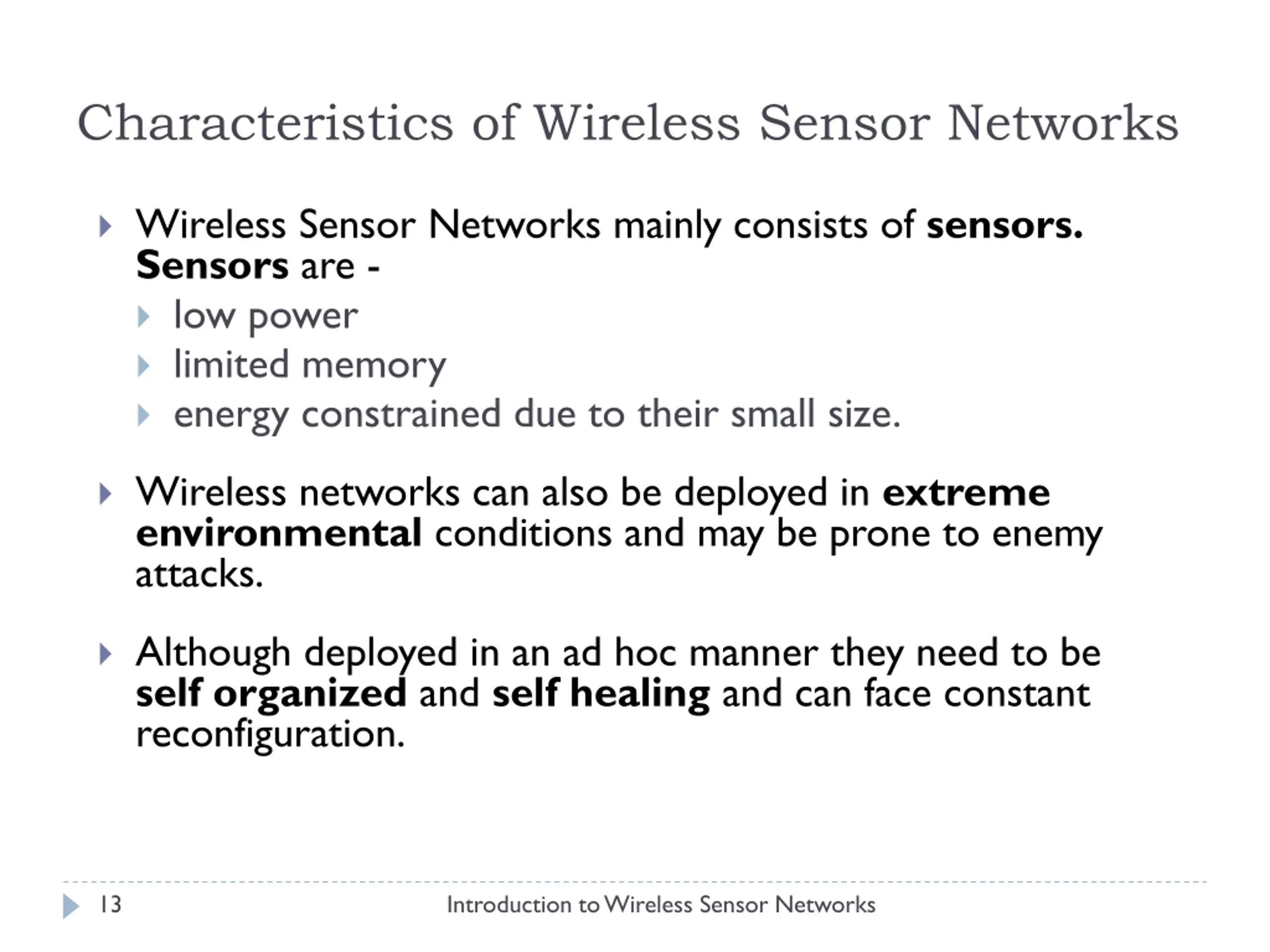 Characteristics of Wireless Sensor Networks Wireless Sensor Networks mainly consists of sensors. Sensors are - low power limited memory energy constrained due to their small size. Wireless networks can also be deployed in extreme environmental conditions and may be prone to enemy attacks. Although deployed in an ad hoc manner they need to be self organized and self healing and can face constant reconfiguration. 13 Introduction to Wireless Sensor Networks