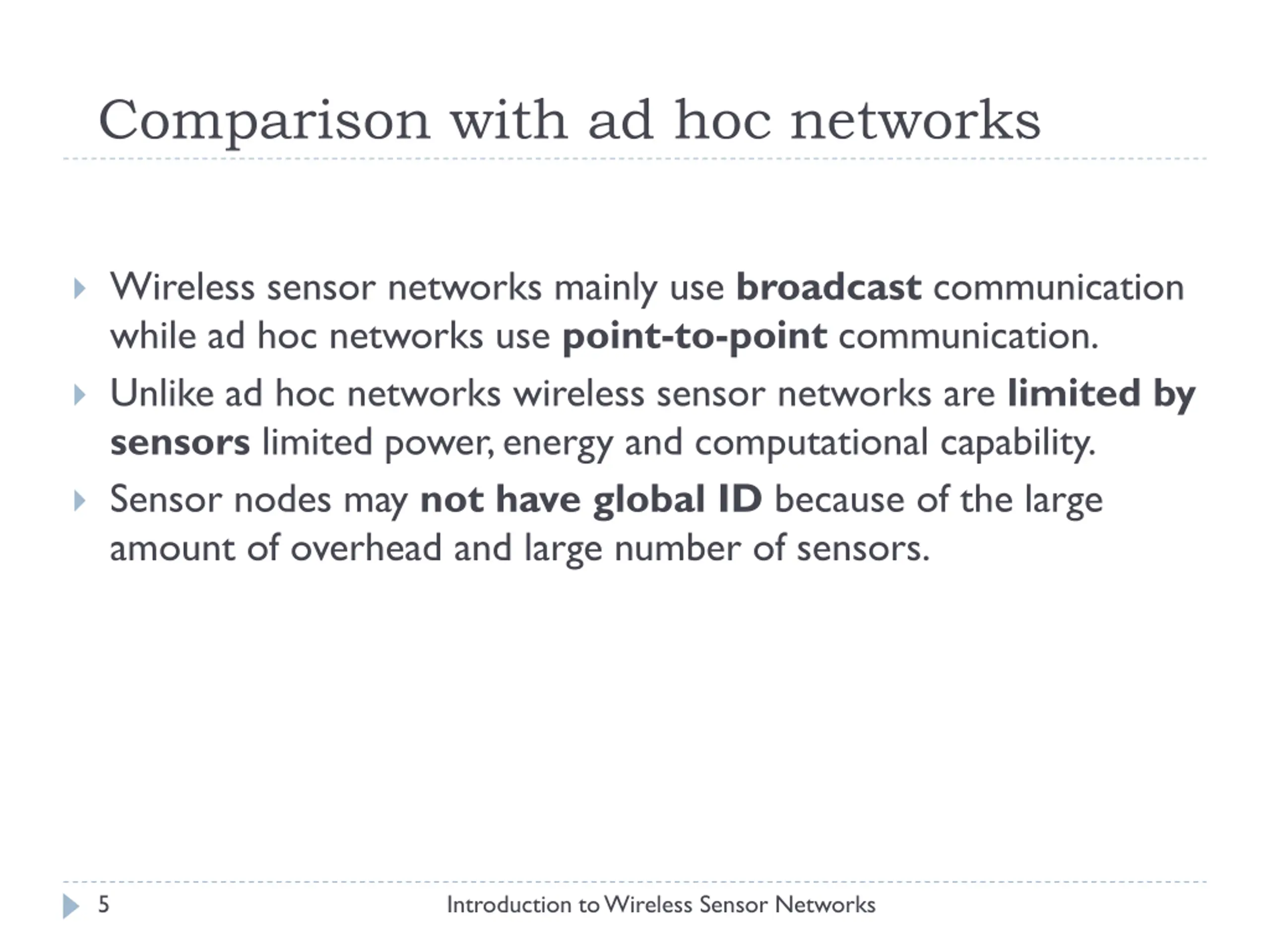 Comparison with ad hoc networks Wireless sensor networks mainly use broadcast communication while ad hoc networks use point-to-point communication. Unlike ad hoc networks wireless sensor networks are limited by sensors limited power, energy and computational capability. Sensor nodes may not have global ID because of the large amount of overhead and large number of sensors. 5 Introduction to Wireless Sensor Networks